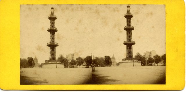Not your average artesian well. The iron tower rose to a height of about 13 storeys; the narrow base accentuated the sense of height. At certain times, visitors could climb the cast-iron circular stairs that wound up the middle of the column, stop on any one of the three circular balconies, and gaze out over the city and countryside. At other times, the tower was shrouded in diaphanous films of water that tumbled outwards and downwards from each of the balconies.