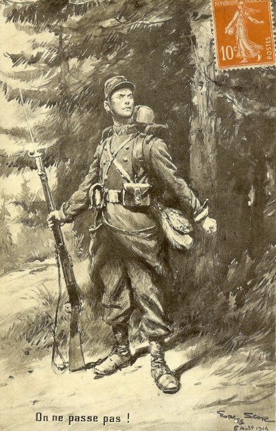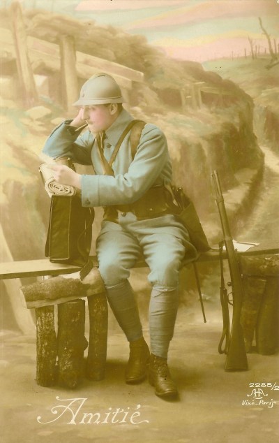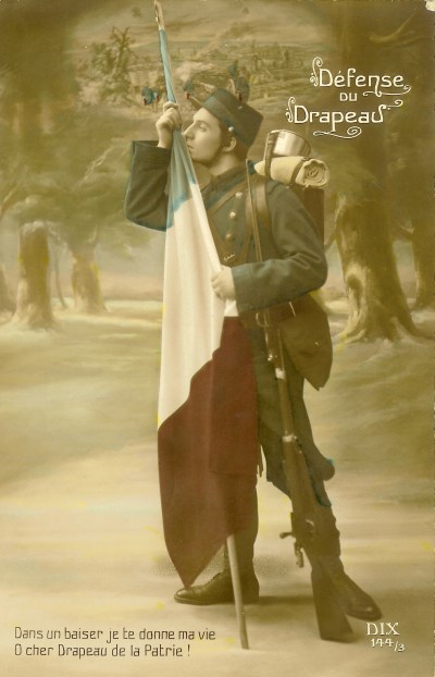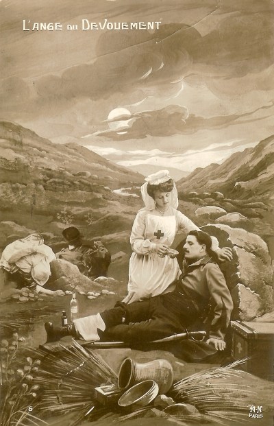 A few months ago, I bought six First World War postcards at an open-air antiques sale near the Bastille. The cards, dated 1914 to 1916, showed patriotic or sentimental images specifically created for wartime correspondence. The patriotic ones showed soldiers expressing devotion to France’s flag; the sentimental ones were of wounded men being treated by angelic (and slightly improbable-looking) nurses.
