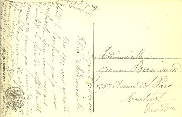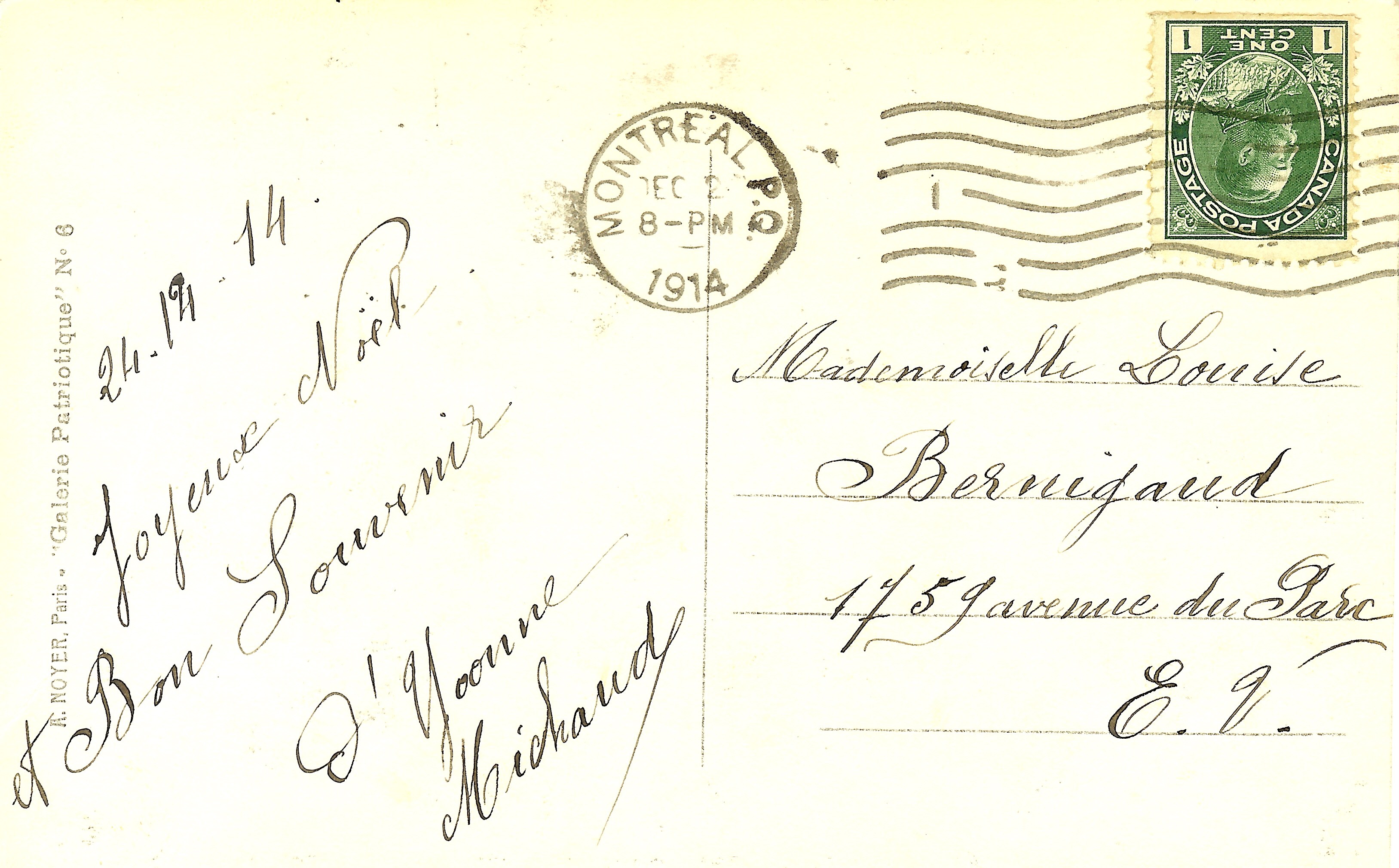 The first postcard (chronologically) was sent at Christmastime in 1914, from one Yvonne Michaud to Louise Bernigaud. It was posted in Montreal and contains the brief message “Joyeux Noël et Bon Souvenir.” There were several Yvonne Michauds in Montreal at the time. So no clues there.