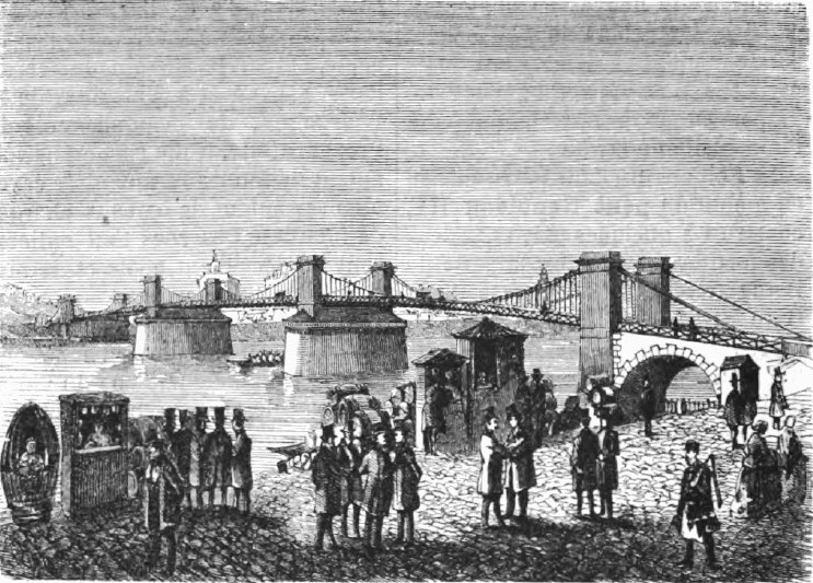 A demolition decree was issued on August 1, 1860, and the whole bridge was gone by 1862. Why? Admittedly it hadn’t been a particularly handsome bridge. Perhaps it was structurally unsound? One obscure publication in November 1850 notes that a commission of engineers examined the bridge and recommended that the suspension cables and deck be “tested to insure solidity.” But that is not what really happened.