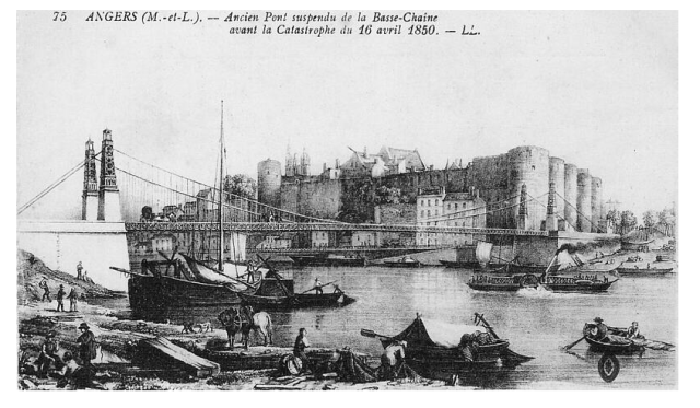The Basse-Chaine Suspension Bridge over the River Maine in Angers was completed on July 16, 1839. Its 335-foot span served pedestrians and wagons well. The bridge had been built “by two of the most experienced contractors in France who had conscientiously adhered to all the rules of the art as then known” (Tom F. Peters, Transitions in Engineering: Guillaume Henri Dufour and the Early 19th Century Cable Suspension Bridges, p. 169). Today we would call it state-of-the-art bridge engineering. France was the acknowledged world leader in suspension bridge design and construction.