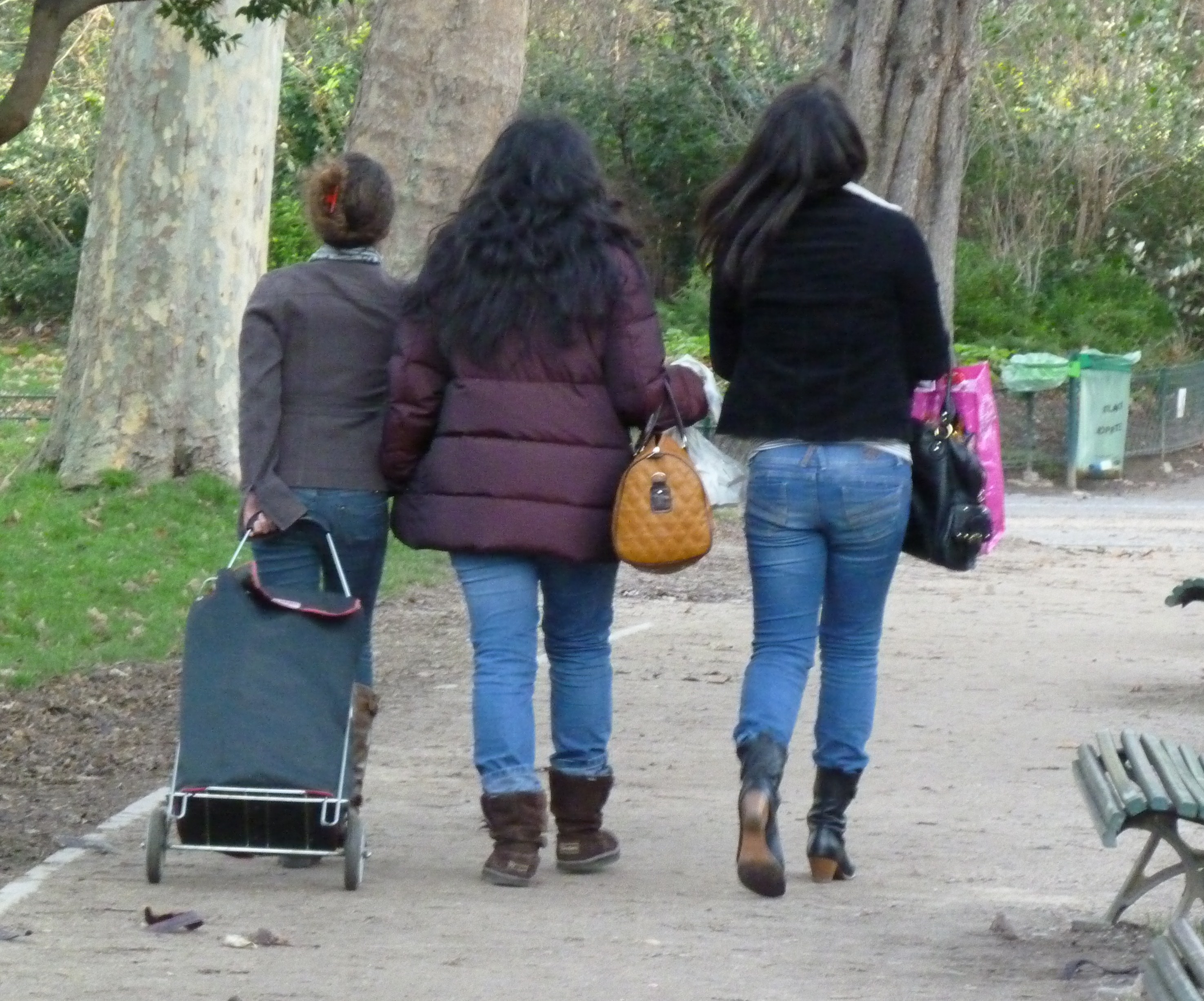 At least the Champs-Elysées is nice and wide. On smaller streets, you must hold the chariot underhand, with your hand held behind your back, so that you and the chariot are single file on the narrow pavement. Here is a picture showing the approved method, although it was taken in the broad allées of the Parc Monceau. Presumably this young woman was simply accustomed to holding it like that all the time.