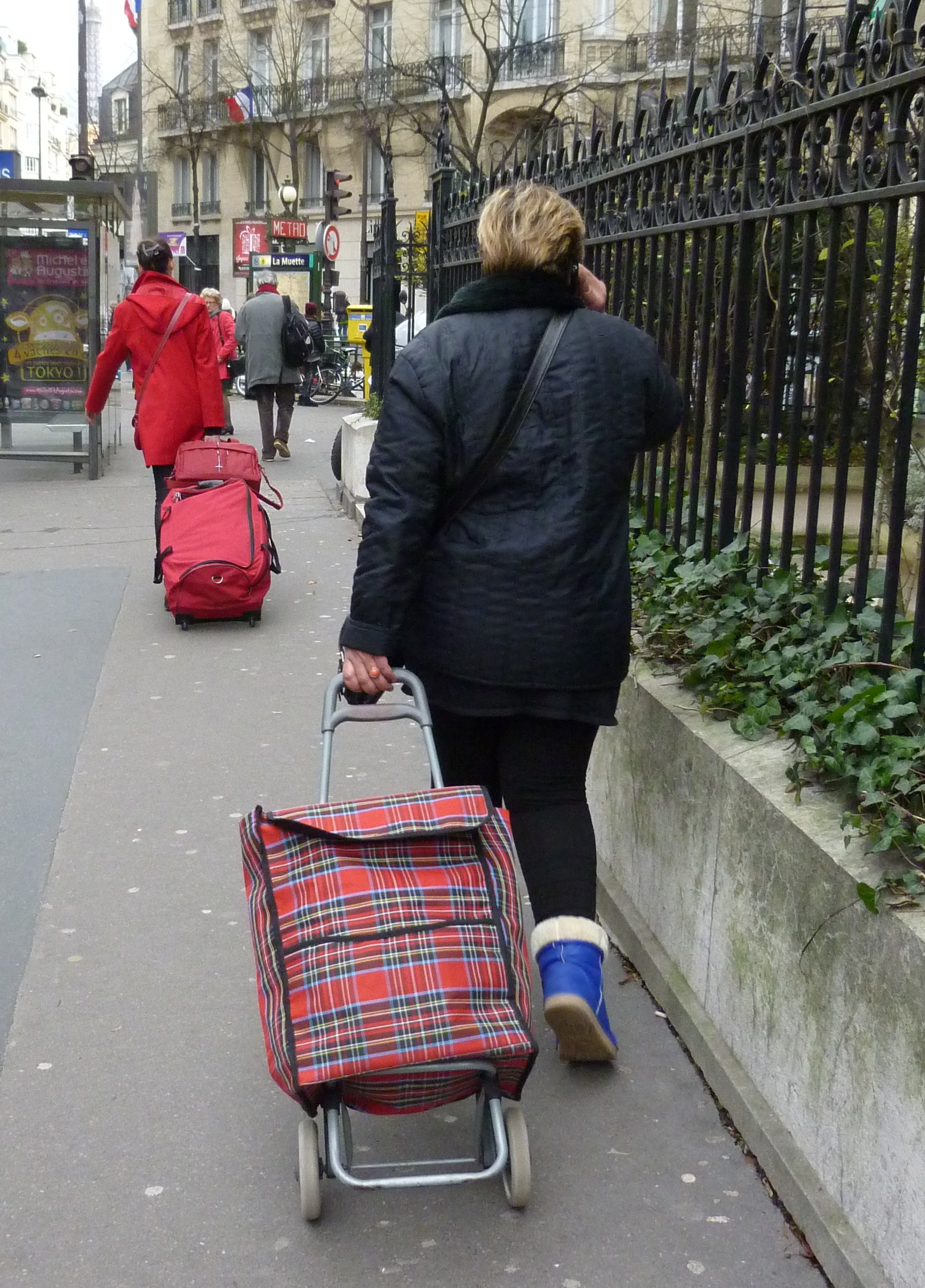 For many people in Paris, owning a car is neither necessary nor desirable. Transit service is good and parking is difficult. But that means that when your groceries include, say, containers of milk or orange juice, bottles of wine or San Pellegrino (San Pé to the Parisians), cans of soup or cassoulet, or jars of jam or tomato sauce, the walk home can feel very long. So do your arms.