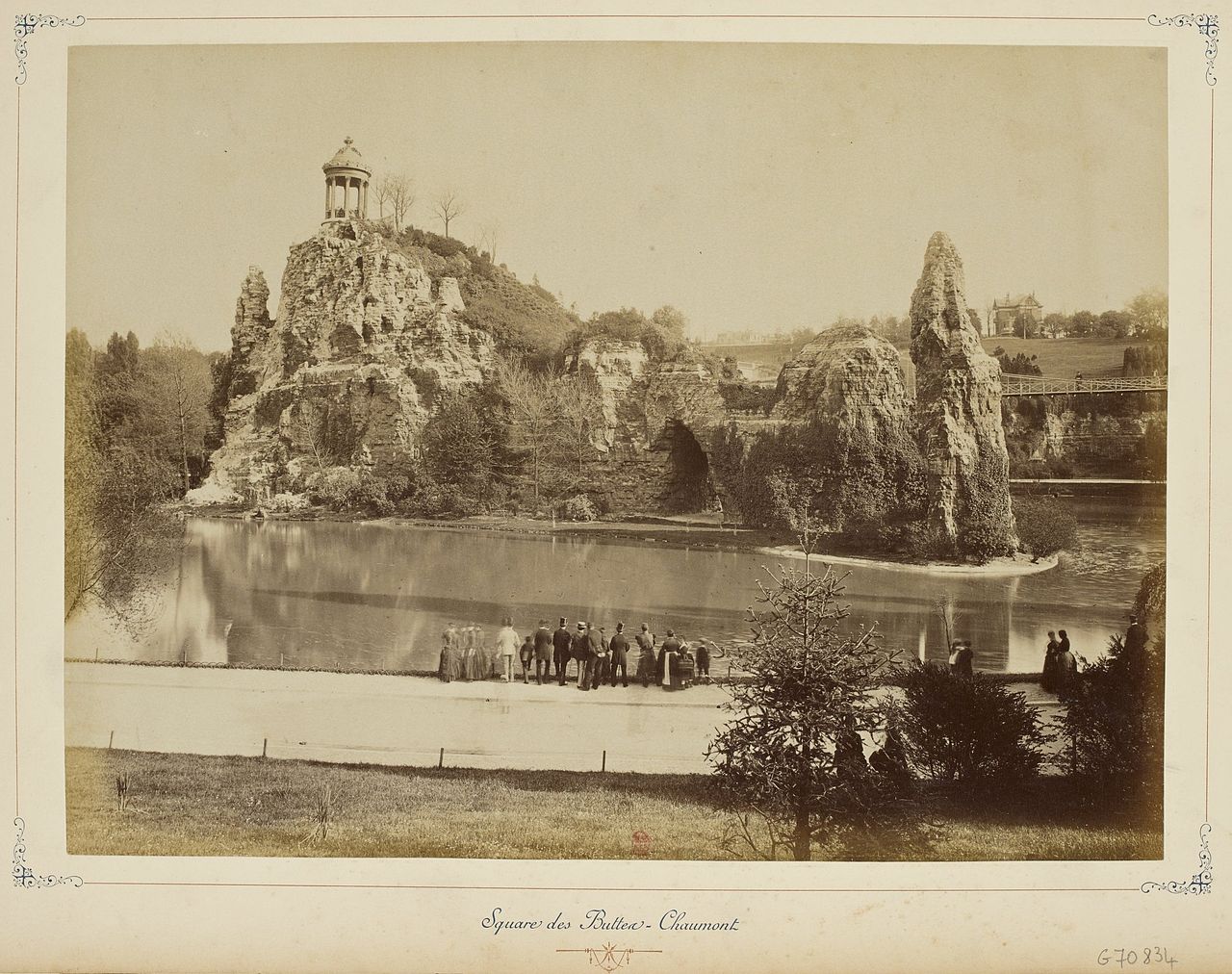 In the photo below, taken between 1880 and 1890, we see an island in a lake, covered with trees. At the top is a temple or belvedere, with a long approach path. On the left is the suspension bridge that connects the island to the main body of the park. The background appears to be densely populated.