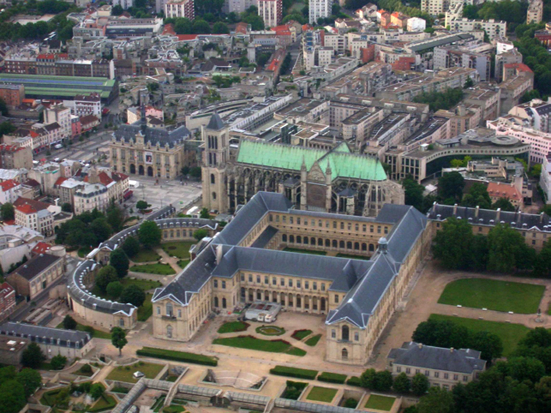 In the aerial view shown above, the basilica is the church with the green roof; the buildings in the foreground are those of the abbey.