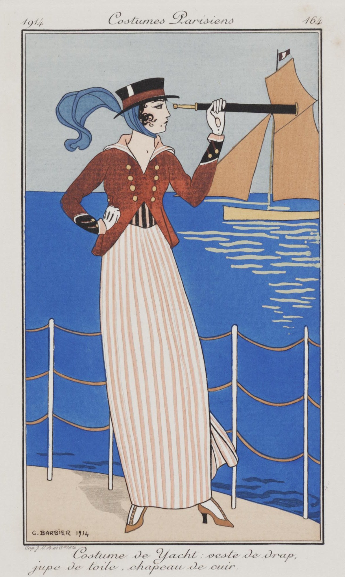 The title “Envie” (Envy) suggests a slightly sinister undercurrent. Drawn for a collection illustrating the seven deadly sins, the maid holding the hat box is presumably the envious one. But such warnings rarely intrude on Barbier’s world. His world is more properly represented by the yachting costume from Costumes Parisiens.