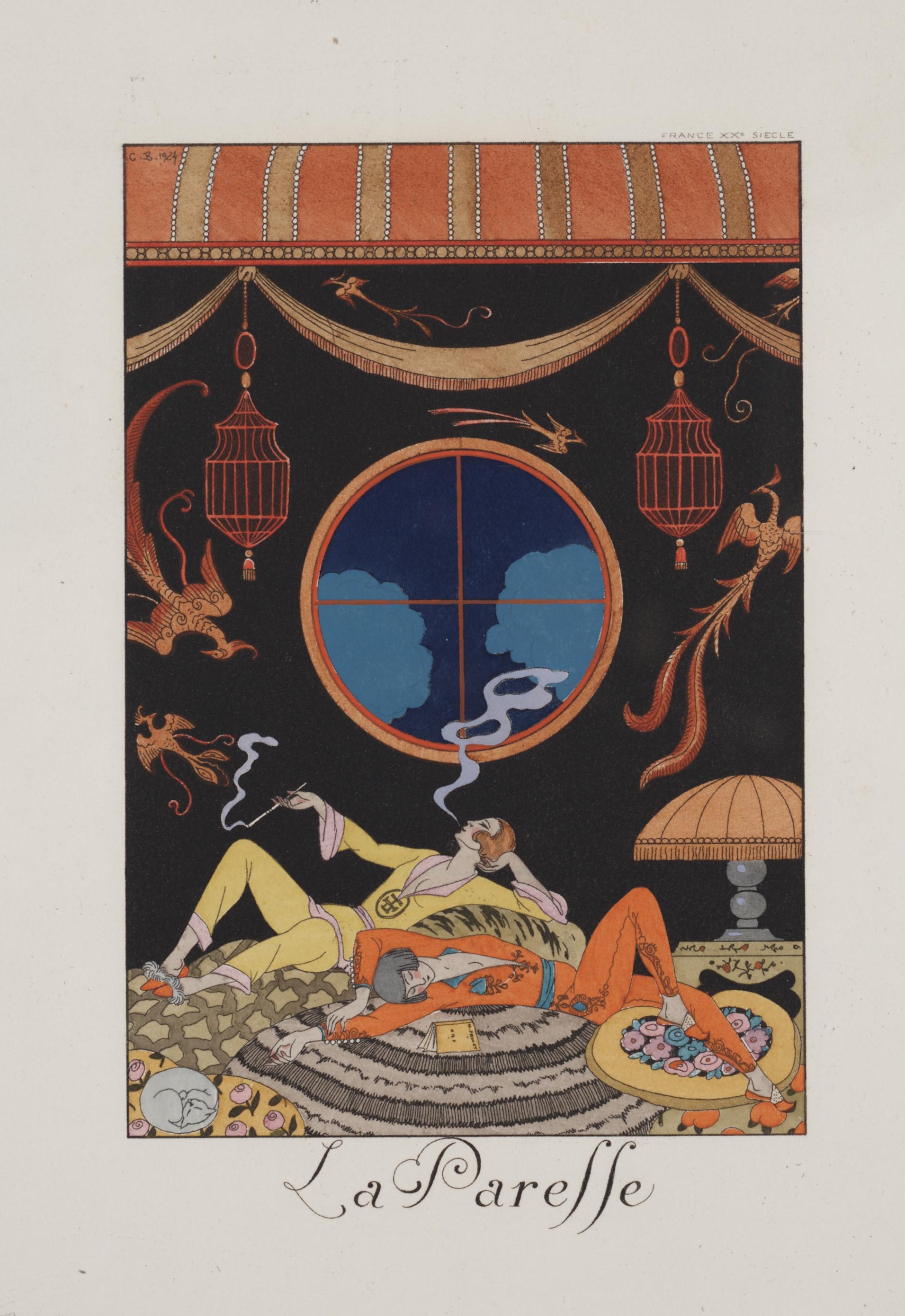 La Paresse (idleness, indolence) is a stunning evocation of the studied indolence so inseparable from many dreams of glamorous Paris. Here we see perfectly what Albert Flament meant when he said of his friend George Barbier, “When our times are lost…some of his water-colours and drawings will be all that is necessary to resurrect the taste and spirit of the years in which we lived.”