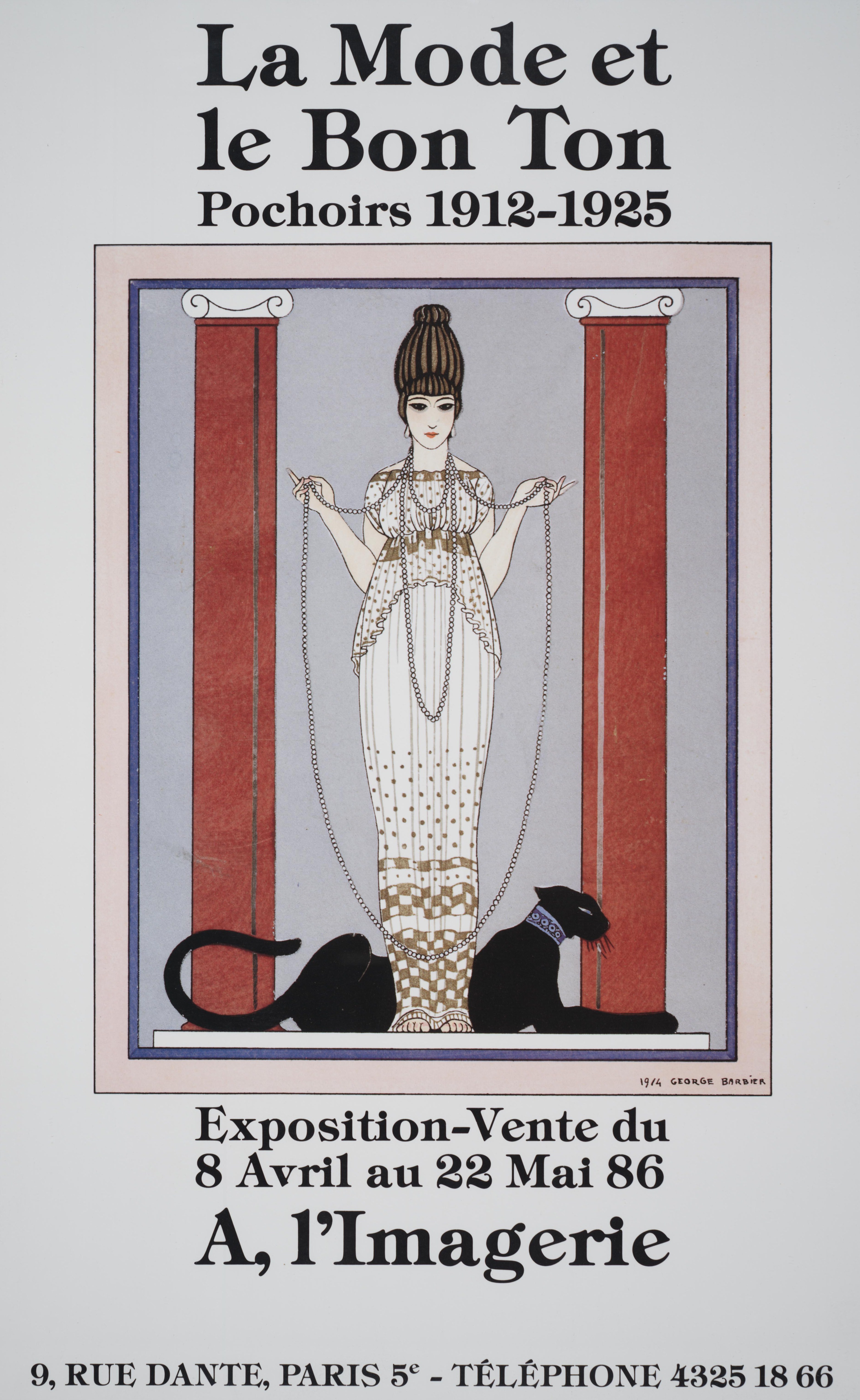 Only later would I learn from Arthur Smith that Barbier created the “iconic piece…the design of the panther that remains emblematic of the House of Cartier to the present day. The image of a classical figure, attired in a Poiret dress, and accessorized by the presence of a black panther, was used on an invitation card designed by Barbier for L’exposition d’une collection unique de perles et de bijoux de decadence antique hosted at La Maison Cartier from 27 May to 6 June 1914. The illustration bore the caption La femme avec une panthère noire, which was reproduced in a 1920s French magazine advertisement for Cartier.”