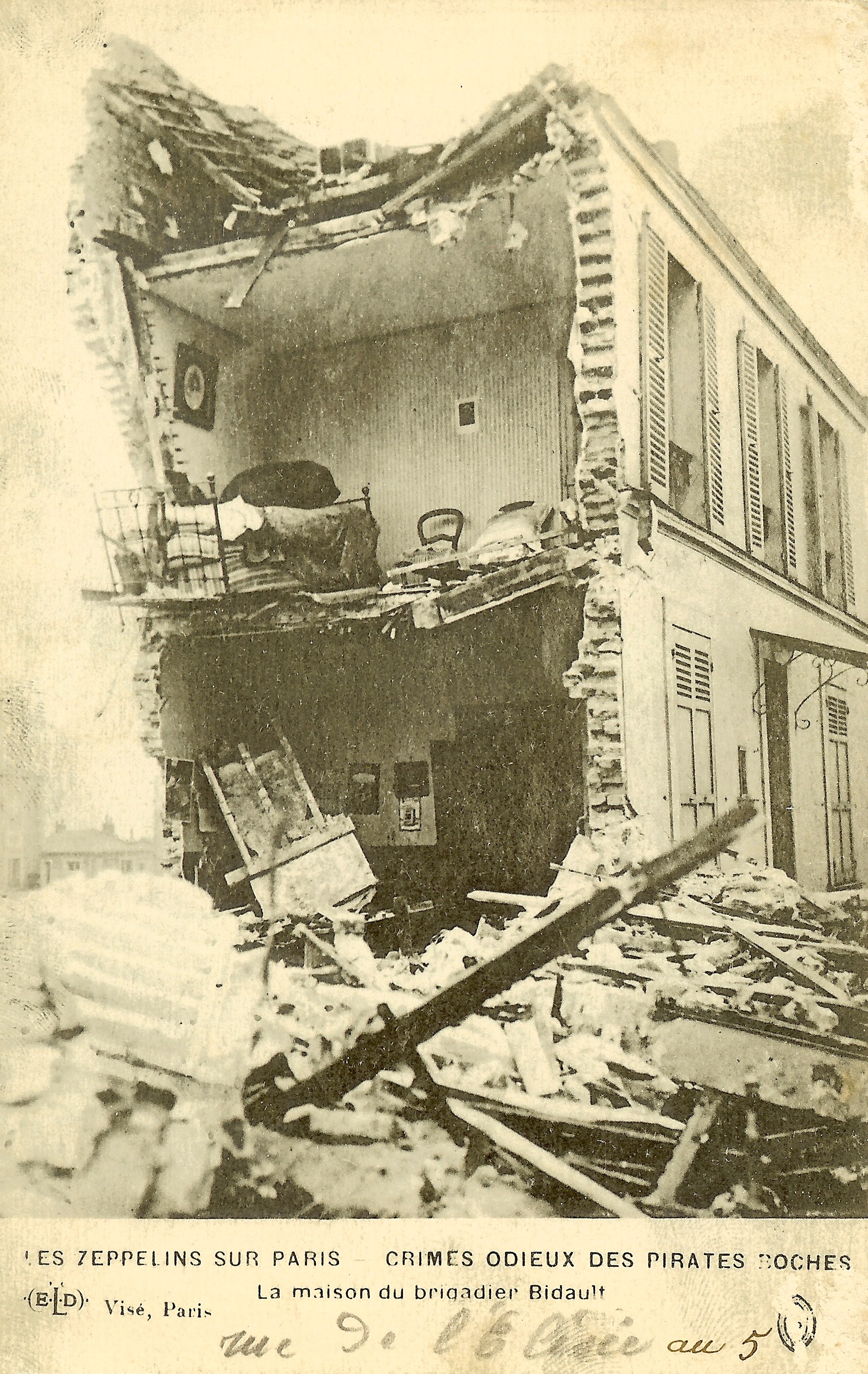 The second shows more damage, a house cut in half. Someone has written in a location (rue de l’Elisée), but this is wrong. A press photograph of the same site on Gallica (the website of France’s National Library) provides additional information: the raid took place on January 29, 1916, at 34, rue du Borrégo, also in the 20th (which seems to have sustained most of the Zeppelin damage). The owner, one sous-brigadier Bidault, was killed.