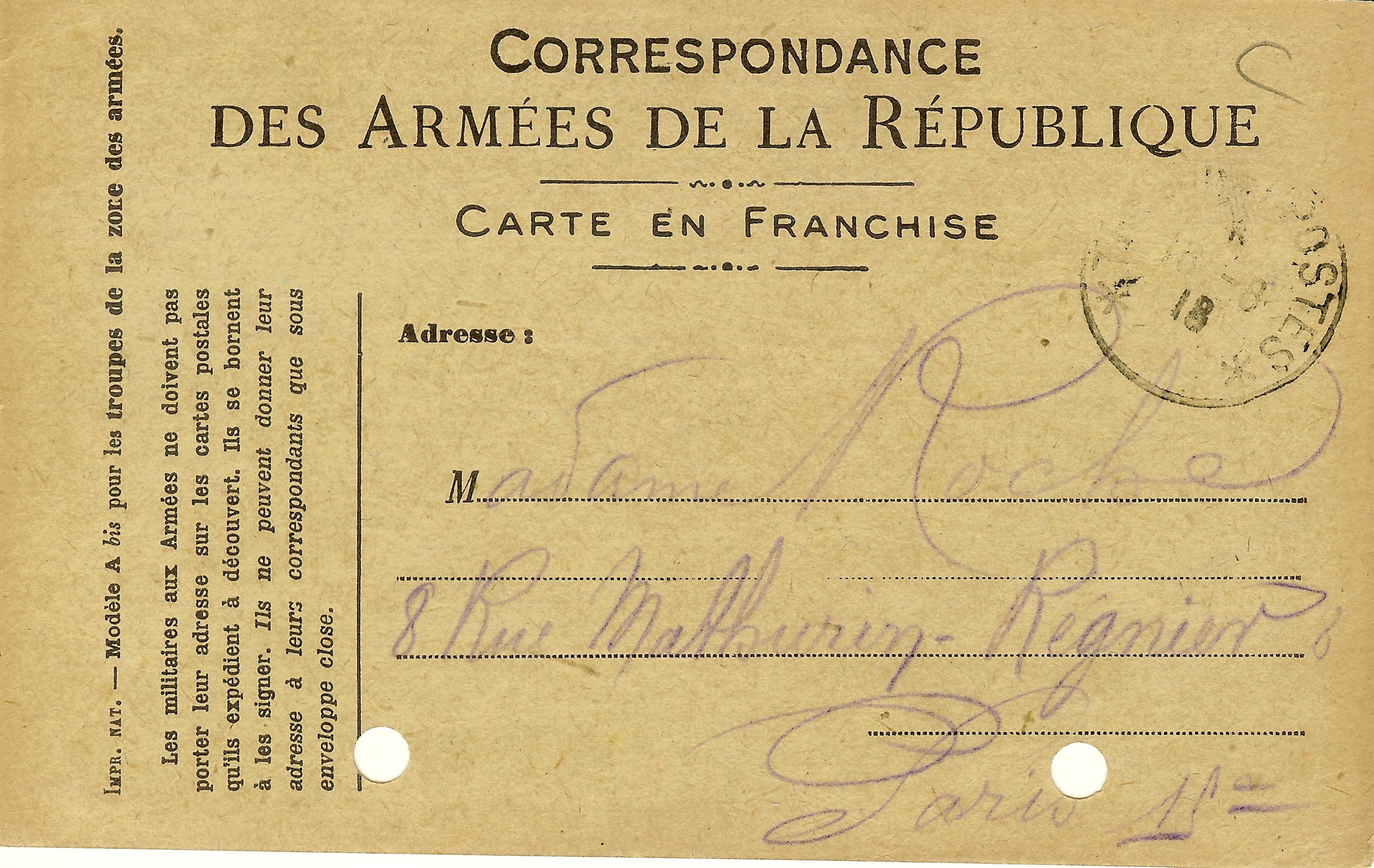 The second was sent in August 1918, as the war was finally turning in favour of the Allies. Gone are the flags and coloured printing – the card has been stripped down to the essentials. A soldier (last name Roche) informs Madame Roche (his wife? his mother?) that he was well (alive and not wounded). She lived at 8, rue Mathurin Régnier, in the 15th, in a house that is still there.