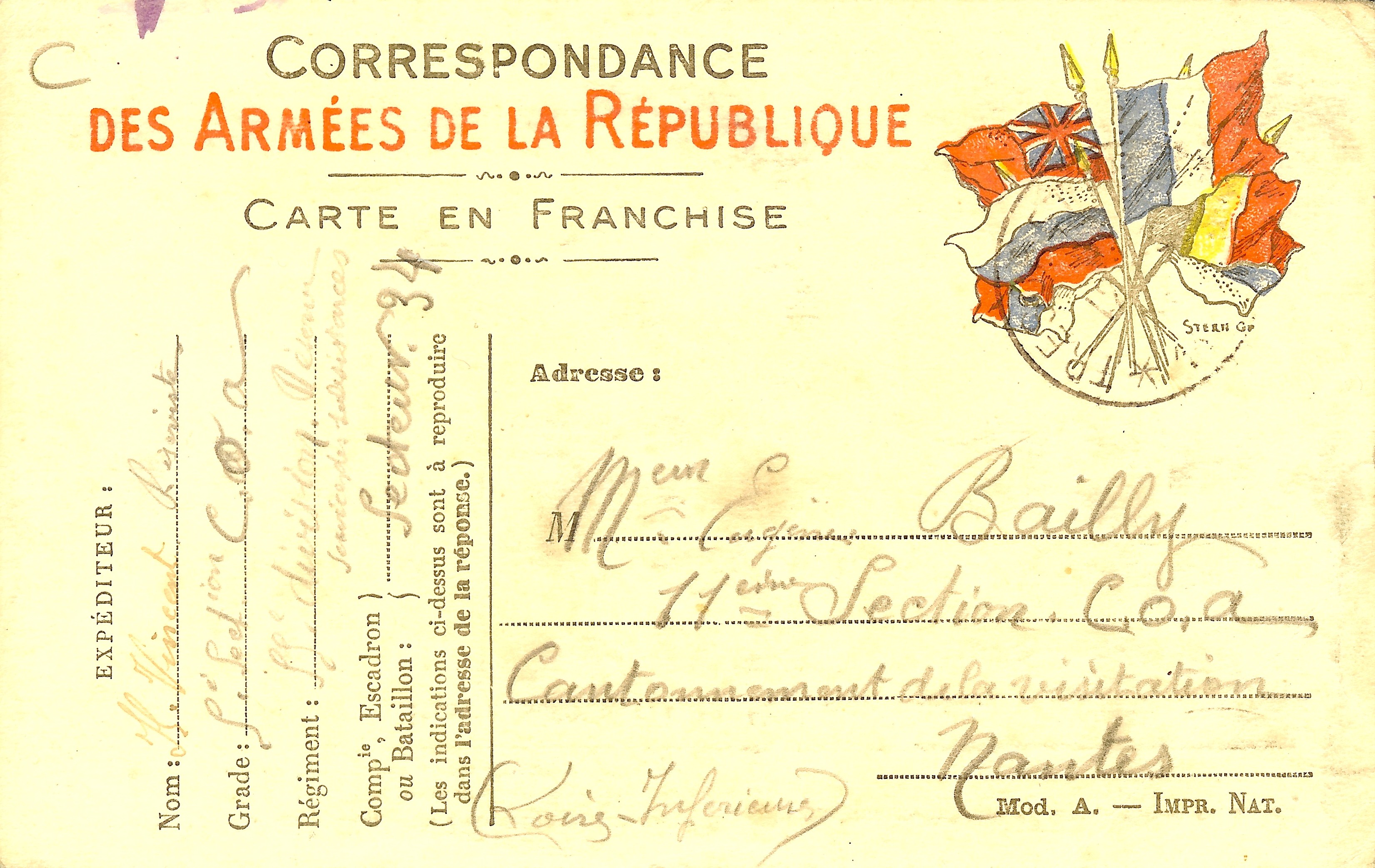 I have two postcards from the Front. The first one was not sent to or from Paris, but it is typical of army correspondence on preprinted cards at that time. H. Vincent, réserviste, writes at some length, with atrocious spelling, to say he has no news. He was serving with the C.O.A. (Commis et Ouvriers militaires d’Administration) – the administrative corps that supported the army. If I’m reading his writing correctly, he was in the 5th Section of the COA, attached to the 55th Division de Réserve. He writes to Eugène Bailly, also in the C.O.A., 11th Section, stationed in Nantes. Nantes was a huge military centre during the war, with barracks and hospitals for both French and (later) American soldiers.