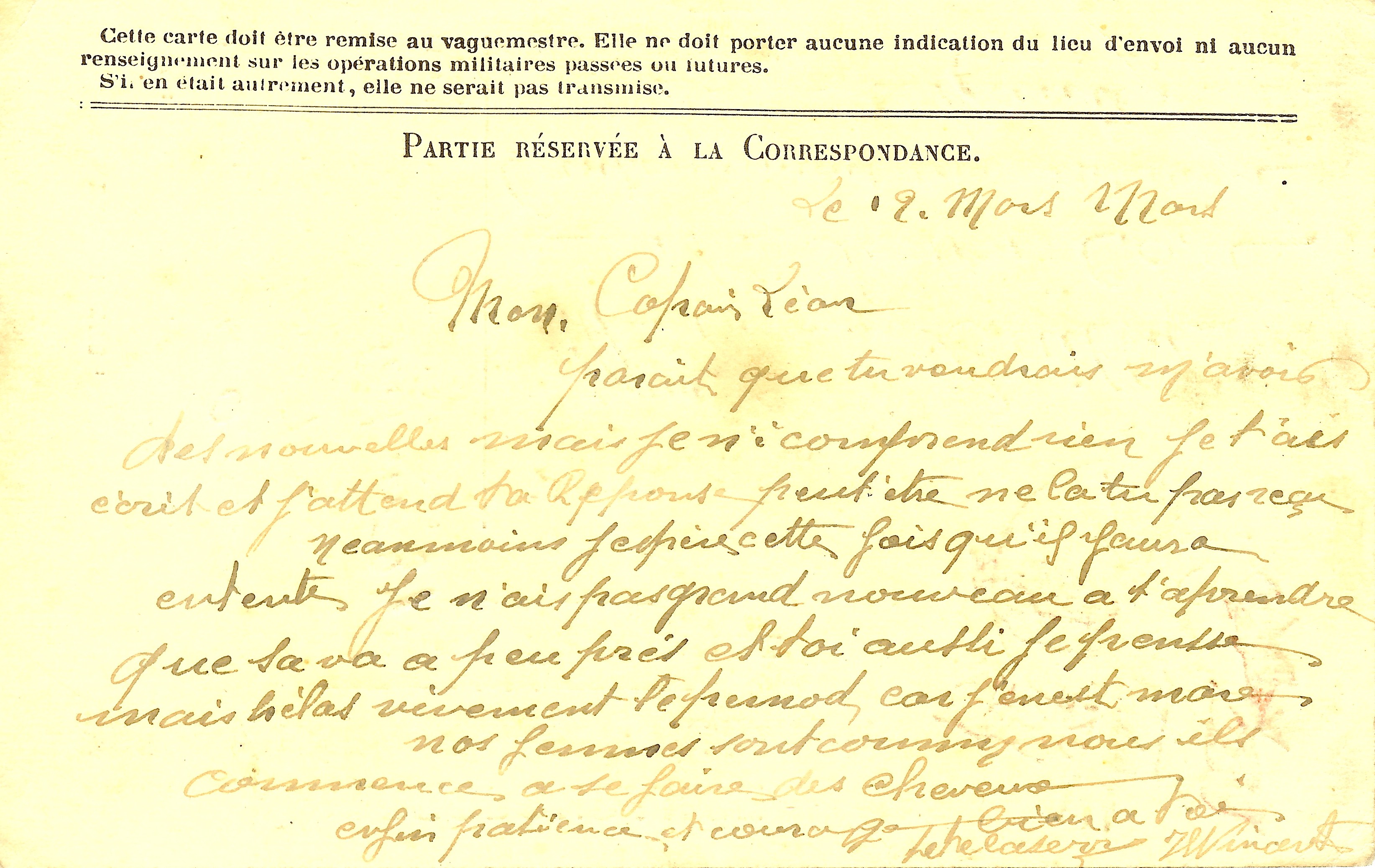 H. Vincent ends his message with “enfin patience et courage, bien à toi.” The postmark is obscured, but I know that it reads “Tresor et Postes,” the French military mark. It is impossible to make out the year. However, by comparing my card with images of similar cards online, I believe it was sent early in the war, because the printed part resembles that of other cards sent in 1914.
