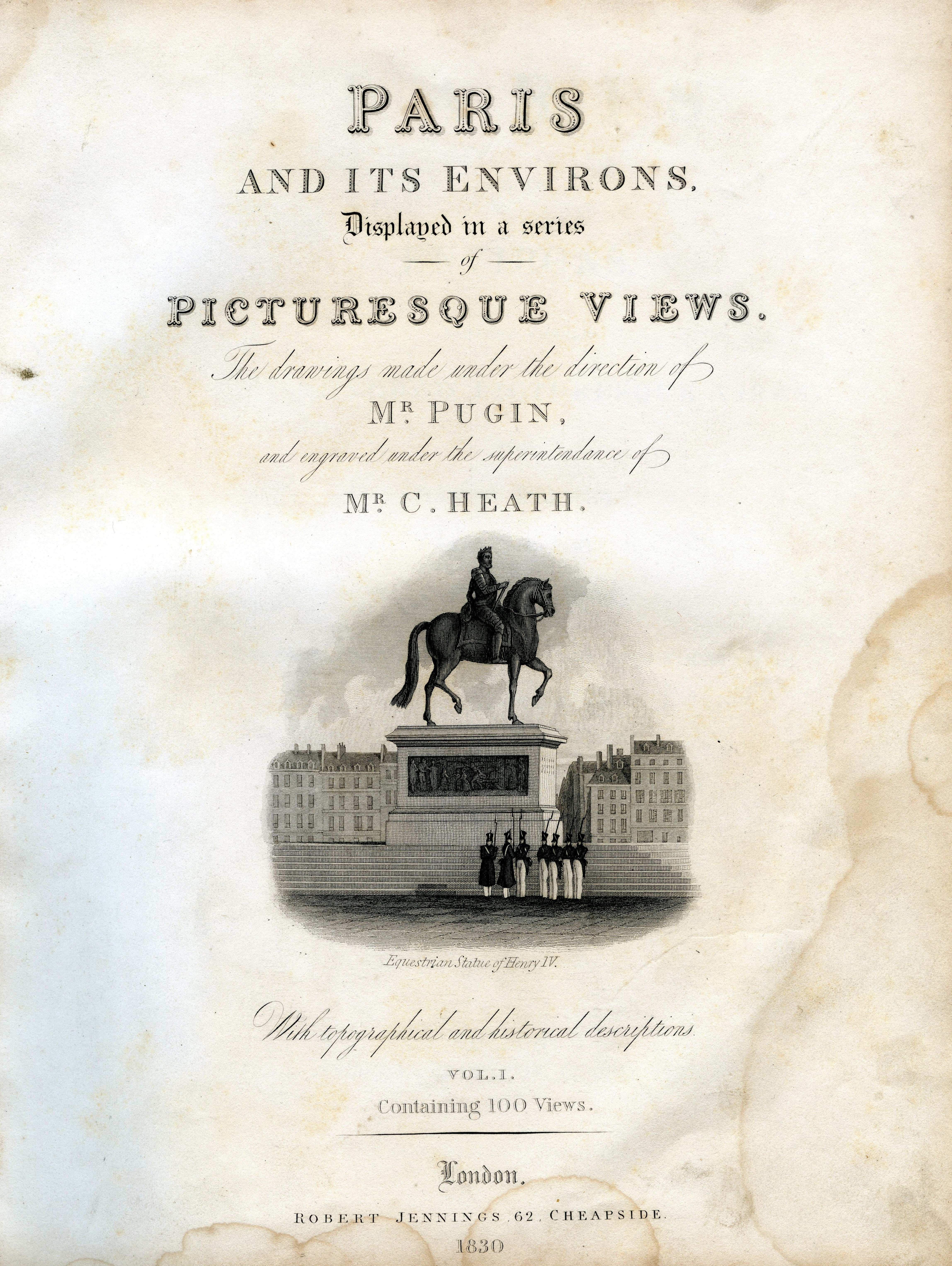 The object of interest had clearly not had a happy life. There was water damage, the binding was fragile with one hinge broken, and the other was ready to go. But it was already an old friend, nonetheless, and it seemed our duty to rescue it. This is how we became the owners of Paris and its Environs Displayed in a Series of Picturesque Views. The drawings made under the direction of Mr. Pugin, and engraved under the superintendence of Mr. C. [Charles] Heath, with topographical and historical descriptions.