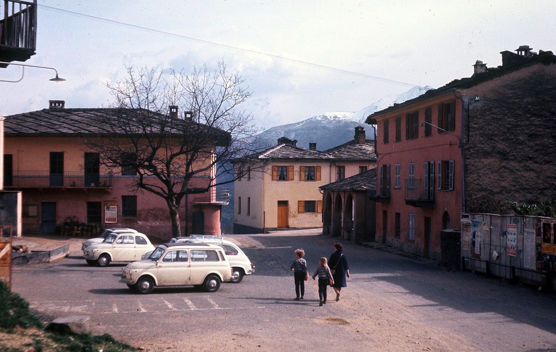 I don’t know what Angrogna is like now, but back then, it didn’t seem to have changed much since the 1920s. My father happily recognized his family’s old haunts. Indeed, the photo below, which he took on that trip, resembles a watercolour my grandmother painted several decades earlier, with the addition of a few cars. And the three of us. (What do you suppose had caught our attention on the left?)