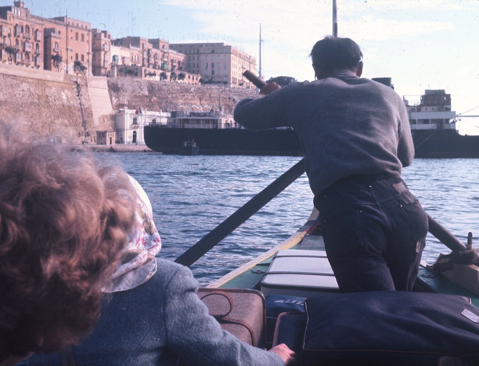 Eventually, we set out on our epic journey home. First, we had to take a djasa (one of the colourful local rowboats) out to a steamer that would take us to Sicily. This is the photograph my father took while we were crossing Valletta harbour with our luggage.