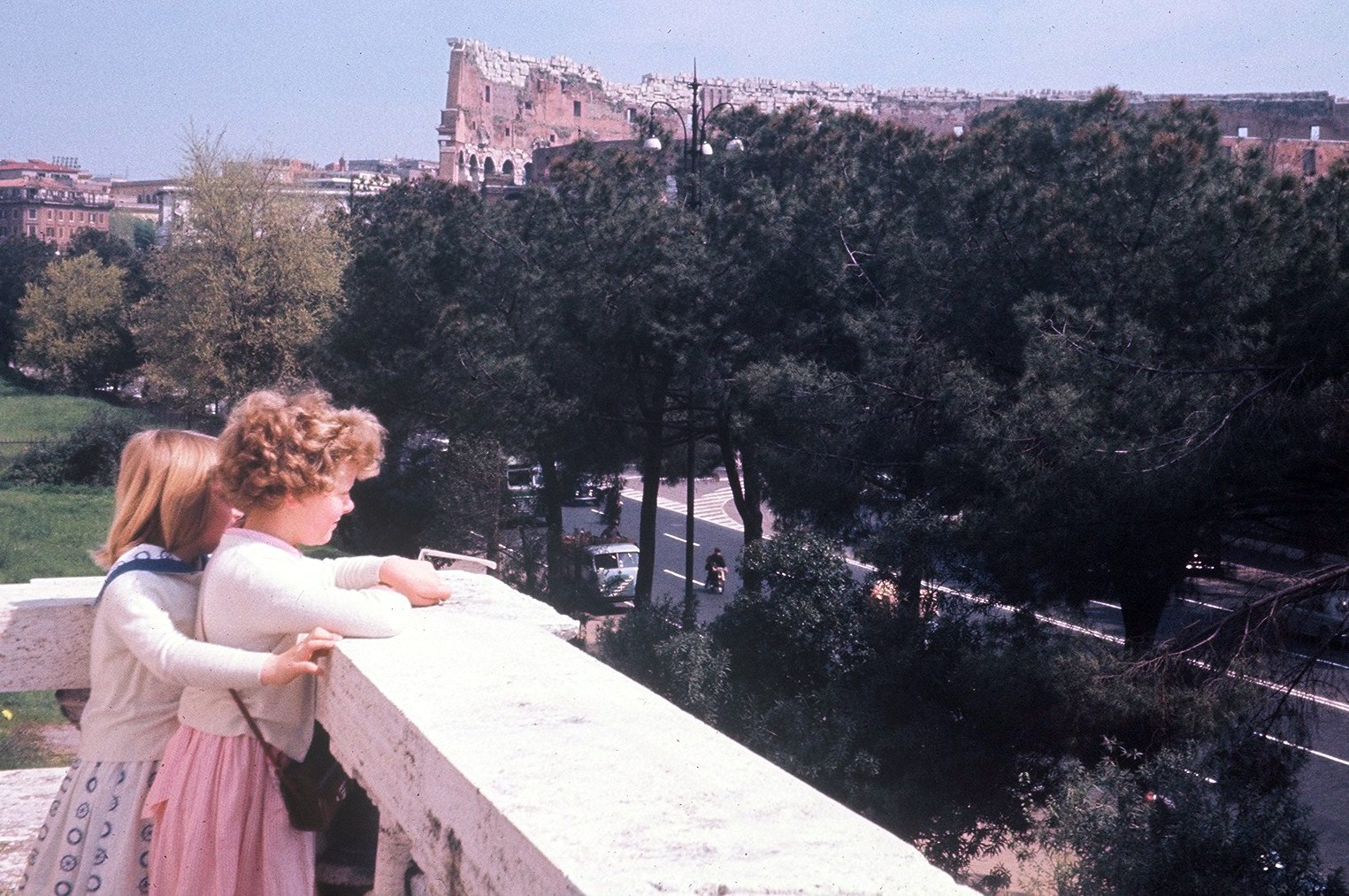 The next day, we took a train to Messina, ferry to Reggio, and another train to Rome, where we stopped for a couple of days. My father’s pictures show us in the Forum and the Boboli Gardens and touring the Vatican. Here Alison and I are standing on the entrance gate to the Palatine Hill, with the Colosseum in the background.