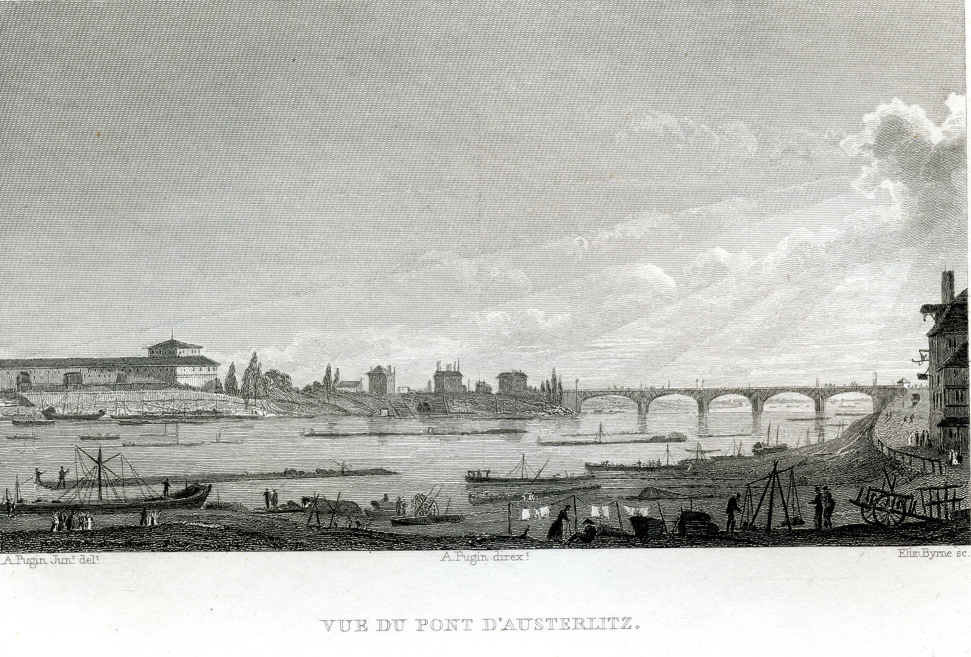 In the nineteenth century, Paris and London were vying to be the greatest city on earth. After praising the Austerlitz Bridge shown above, Pugin asserted that “the quiet river scenery of this plate will remind our English readers of some views of the Thames in the neighbourhood of the British metropolis, and particularly one just above Vauxhall. There is indeed a striking similarity in the light and elegant character of the Pont d’Austerlitz and that of the Vauxhall Bridge. Both are also models of that great modern improvement in aquatic architecture, the cast iron bridge.” It was also a place to appreciate “the placid flow and unpretending character of the Seine [that] always appears to us to form an agreeable contrast with the magnificent works of art on its shore.”