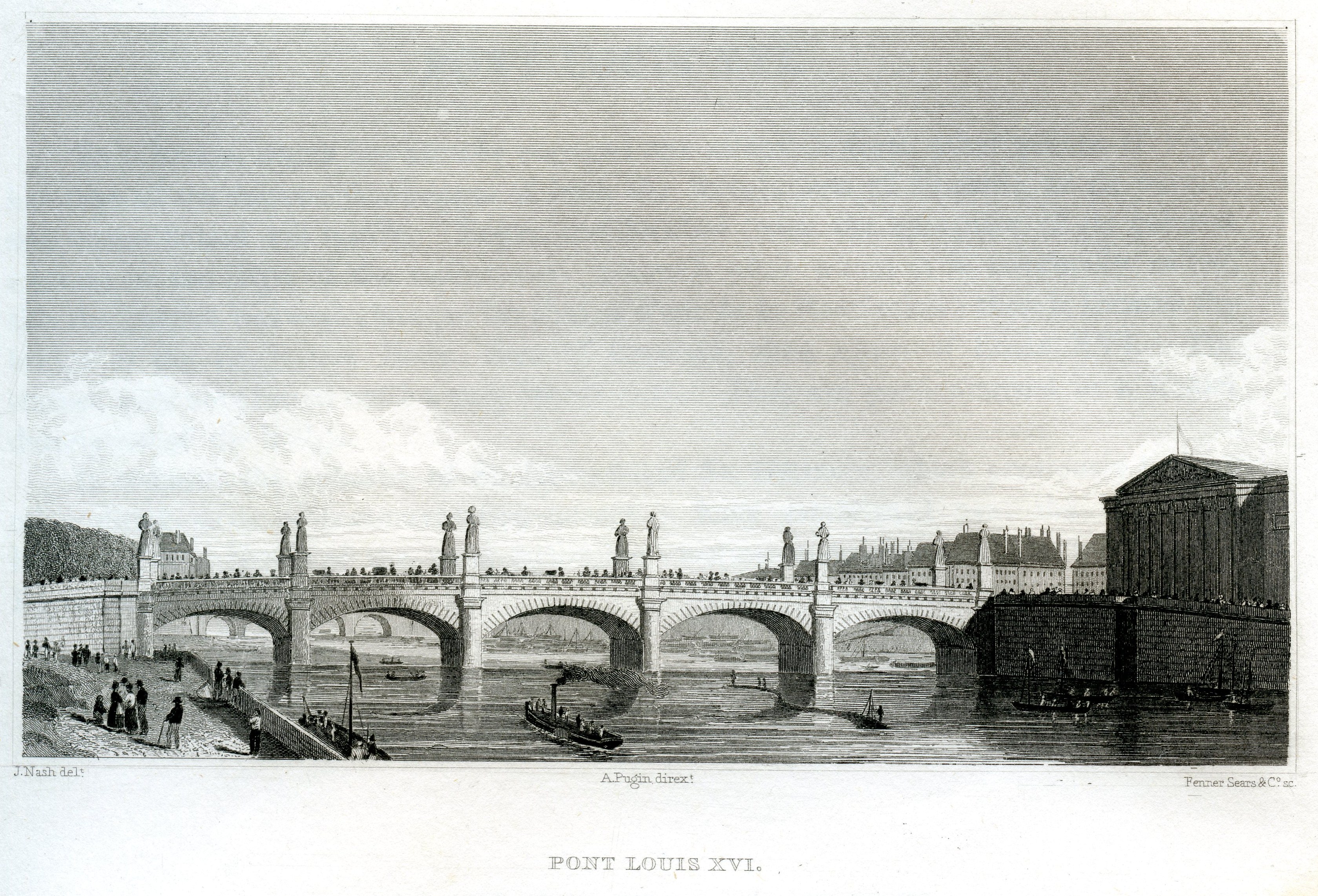 Some bridges took a long time to get built. “In 1722 the city of Paris had been authorized by Lettres patentes to raise a sum of money for the erection of a bridge opposite the Place Louis XV.” Time passed. Nothing happened. In 1786 Louis XIV issued an edict to allow “a loan of 30,000,000 livres to be employed in embellishing Paris, out of which 1,200,000 livres were assigned towards defraying the expense of erecting this bridge.” By that time, France was in dire financial straits and tension was rising. Construction started in 1787 and finished at the end of 1790, but events had overtaken the bridge. A year earlier, on 14 July 1789, the storming and subsequent destruction of the Bastille freed up more stone for the building of the bridge originally intended to honour Louis XVI.