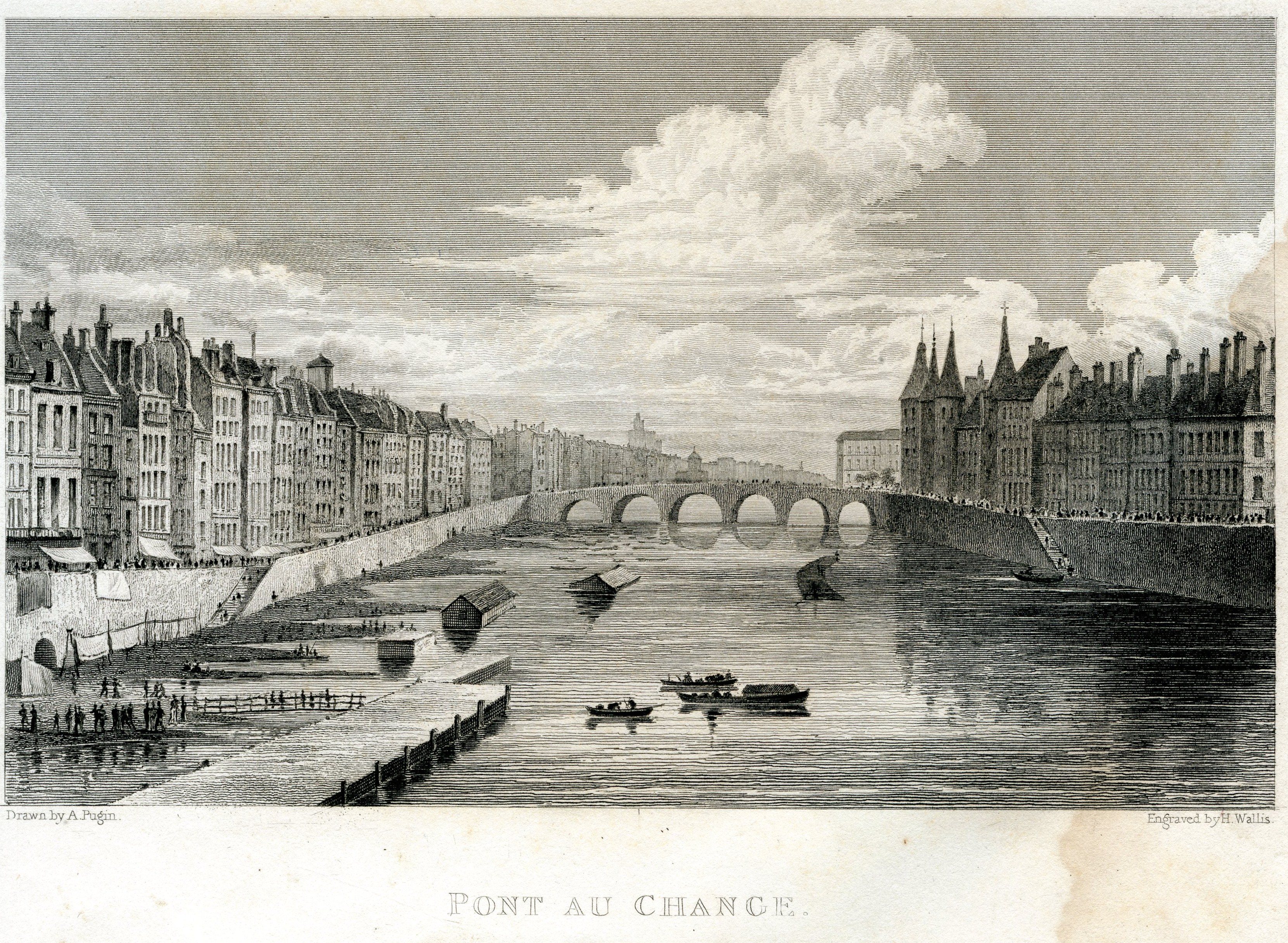 The Pont au Change that exists today was built in 1858-1860. As the link between the Place du Châtelet on the right bank and the boulevard du Palais on the Île de la Cité, it is an important part of the north-south transportation network. In the image above, we see it as it looked in 1831. But this is just the tail end of the story. Paris and Its Environs Displayed in a Series of Two Hundred Views (1831), from which this image by Augustus Charles Pugin is taken, tells us that the Pont au Change “has existed in one shape or other, from time immemorial.” The phrase “one shape or other” is important.