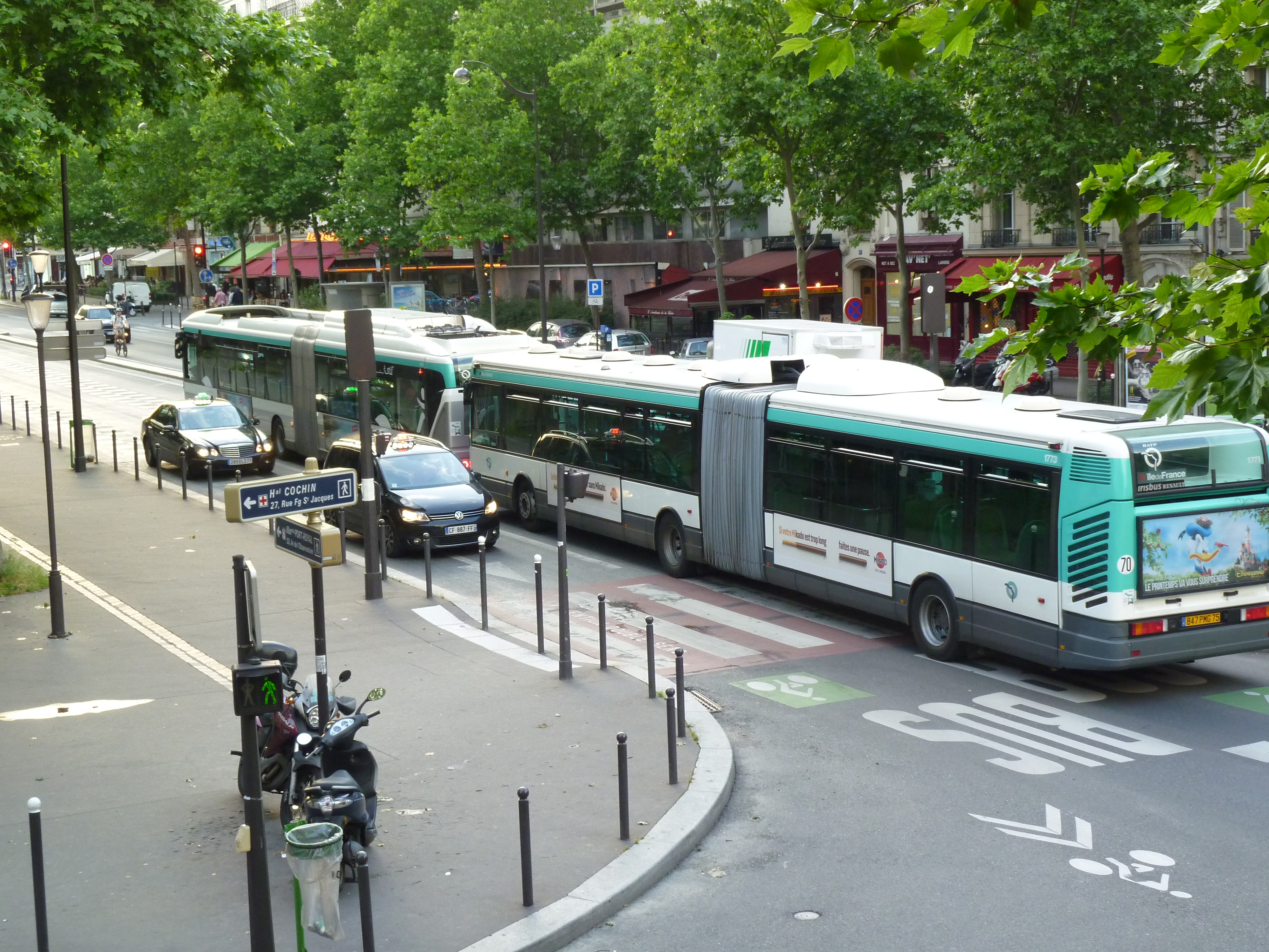 Two bus lines serve the boulevard: the 91, which shuttles between the Gare Montparnasse and the Place de la Bastille (unless it short-turns at the Gare de Lyon), and the 83, which arrives less frequently to take people between the Porte d’Ivry at the city’s southeastern edge and Friedland-Haussmann on the Right Bank. The busy 91s are long, articulated, low-floor vehicles; the 83s are ordinary buses. Instead of horns, the buses have bell-like chimes to warn pedestrians or stopped vehicles of their approach. From what we can see, Paris bus drivers seem both observant and patient – people running to catch the bus at the last moment usually succeed.