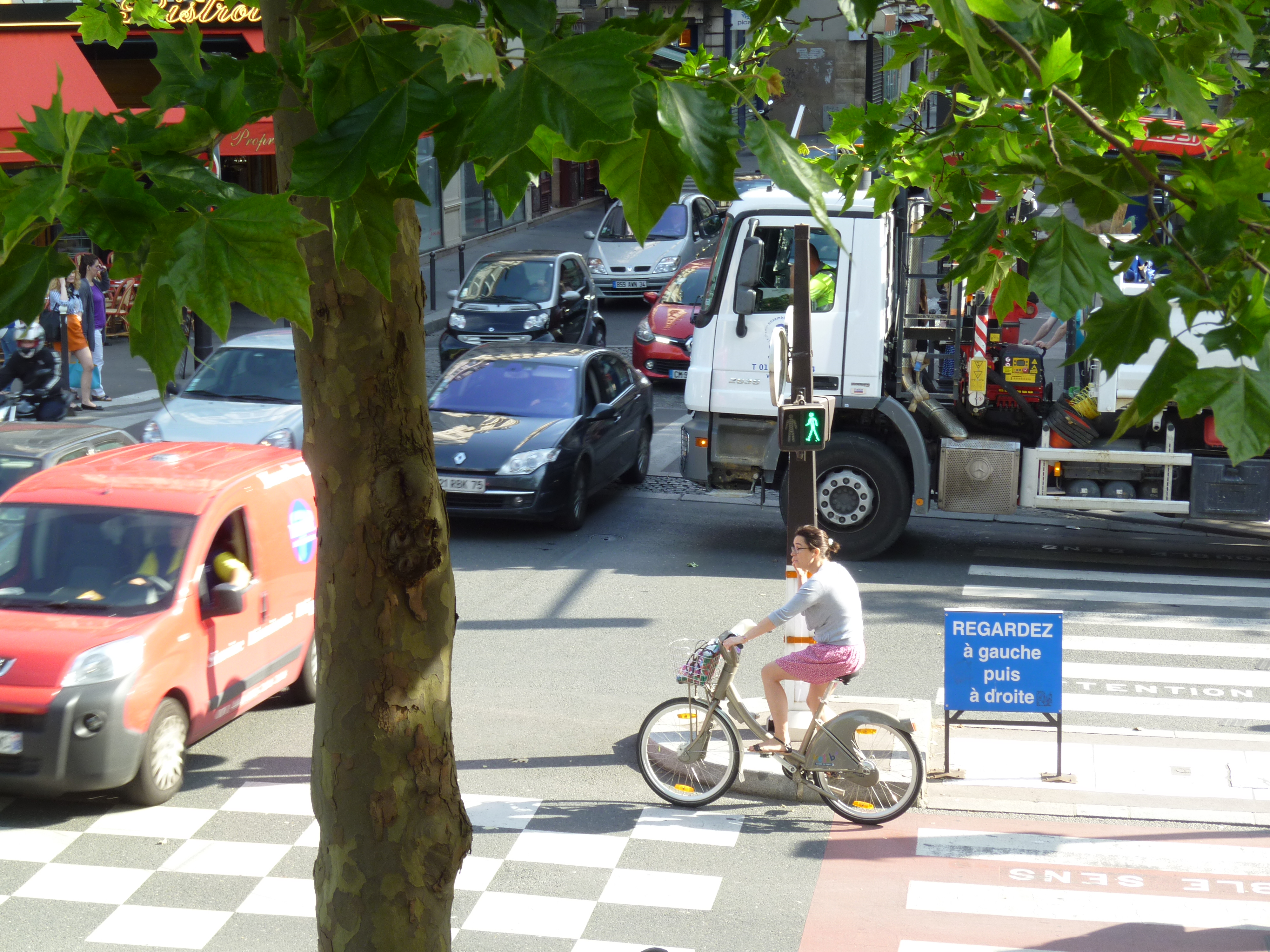The traffic provides free entertainment because the intersection is complicated. There are four lanes on the boulevard, but they are not, as one would expect, two westbound lanes on the north side and two eastbound lanes on the south. Rather, there are two lanes of regular traffic in either direction on the north side, and two lanes of buses/bicycles/taxis/service vehicles in either direction on the south side.