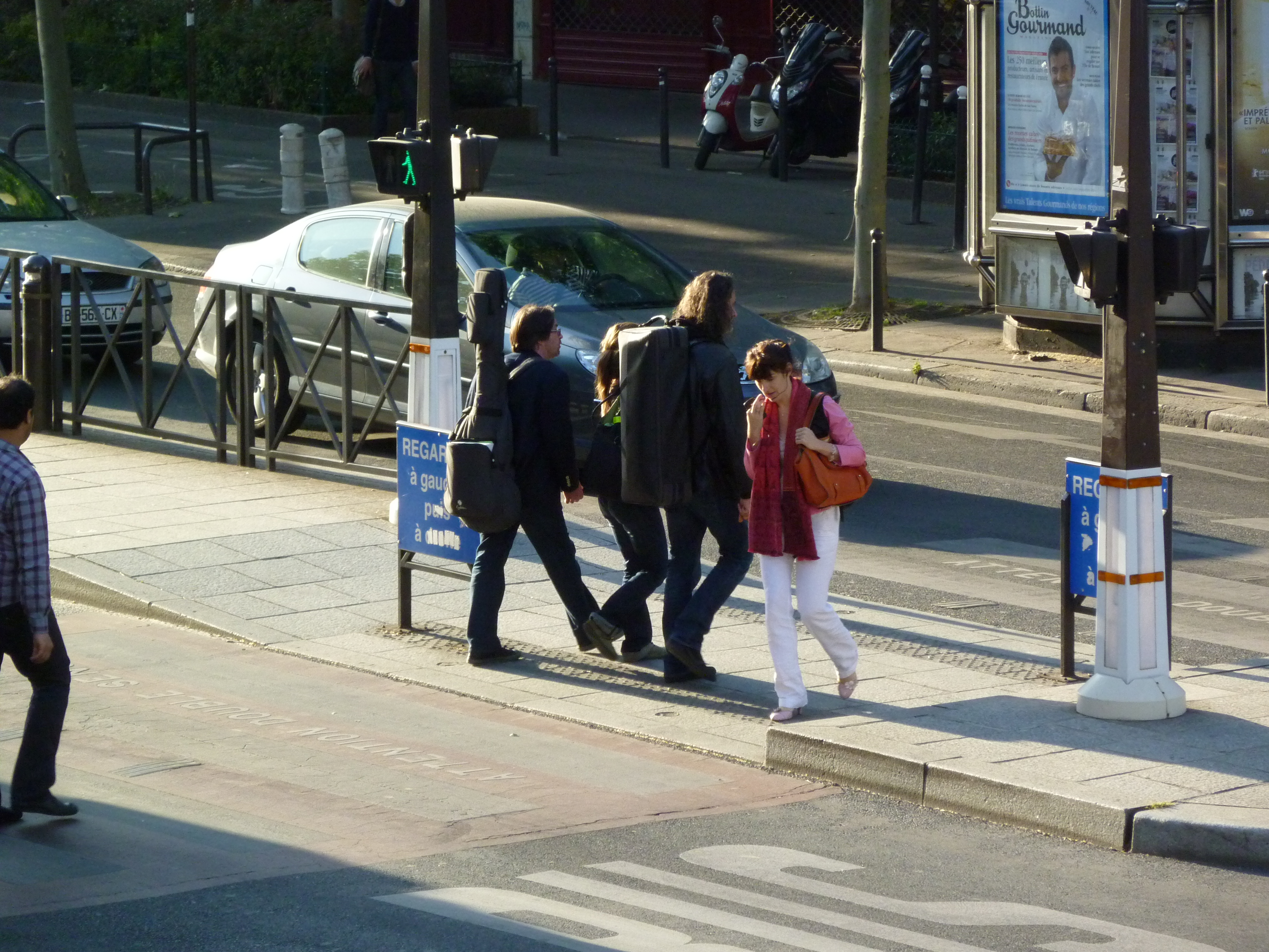 Perec noted many tourist buses, but this is not prime tourist country – although this morning we noted a baffled pair consulting a map on the opposite corner. Rather, we see commuters on Velib’s with briefcases in the baskets, people with shopping caddies going to the market, children on scooters, joggers hooked up to MP3 players, and people with musical instruments in specially designed backpacks (there is a music school nearby).