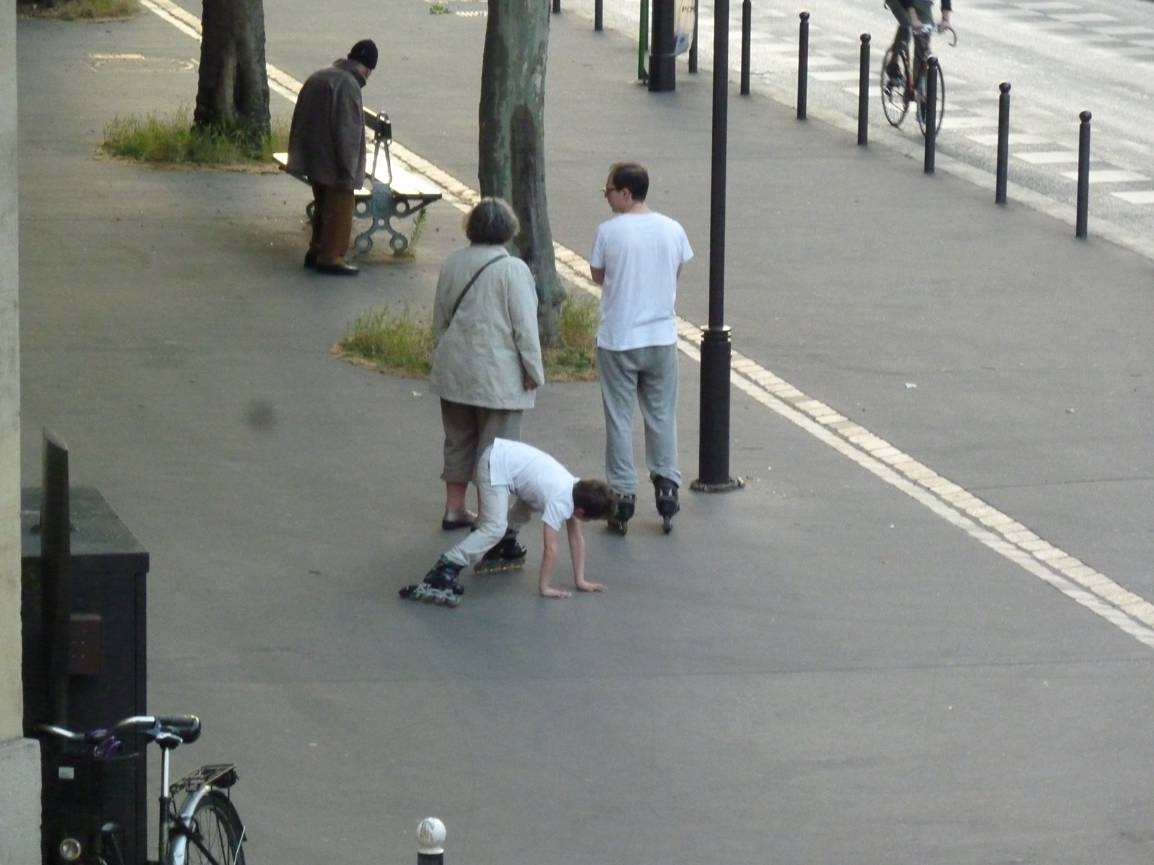 I watch a little boy rollerblading with his father. Eventually, I realize that two older people nearby watching the boy must be his grandparents.