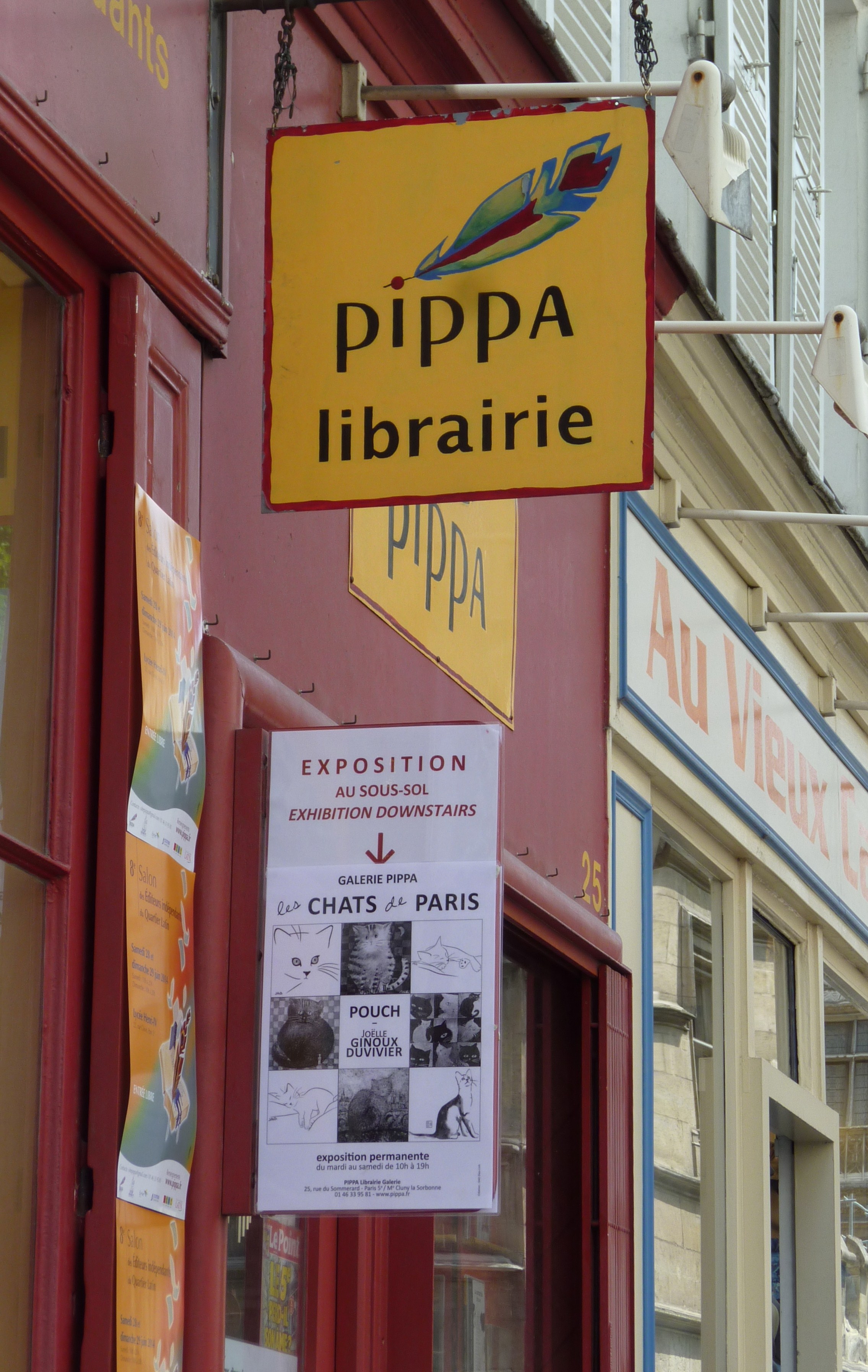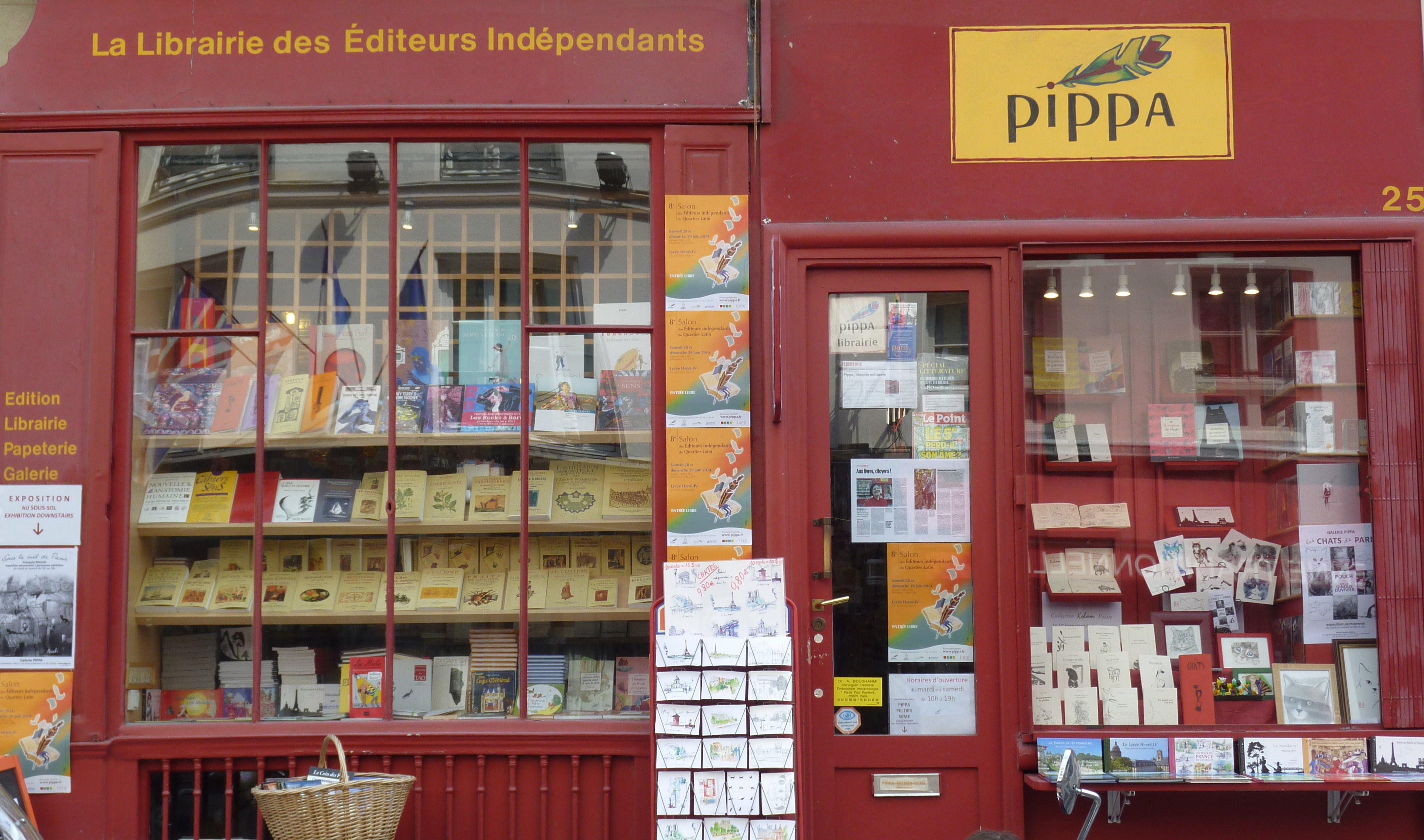 We then wandered on to a bookshop-gallery at 25, rue du Sommerard called, appropriately, Pippa (since Pippa is the short form of Philippa’s name, used by family and old friends). The previous week, at a poetry market in the Place St-Sulpice, we had seen someone with a bag on which was printed the bookshop name and had decided that this would make a good birthday destination.