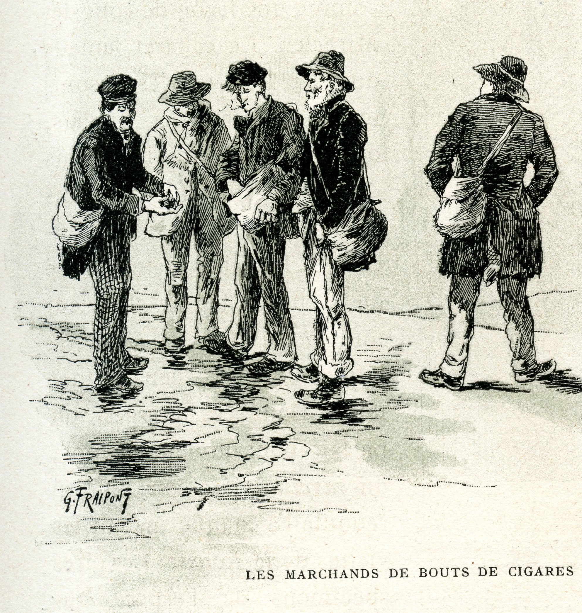 In this shady milieu the honest people are represented by the scavengers of cigar butts, who have an industry that is respectable, even if not lucrative. Badly dressed in grimy, ragged clothes, the scavengers go into the rich areas, on the boulevards when café terraces are filled with guests; they watch intently around the theatres. Their eyes on the ground, they chase after bits of tobacco. The most well-off have a hook to grab the cigars thrown away by the smoker; the poorer ones pick up the remains with their hands. All of them have large pockets or bags to gobble up their harvest. The prodigality of the rich feeds their small earnings. In fact the streets give to those who exploit them more tobacco than that produced from ten fine plantations. Cigarette butts, cigar ends, either common or high-priced, the orphans abandoned on the sidewalks and carefully collected each day give a harvest of appreciable value. There are often pieces of good fortune, for the most expensive cigars, the havanas worth three francs, were rare finds.