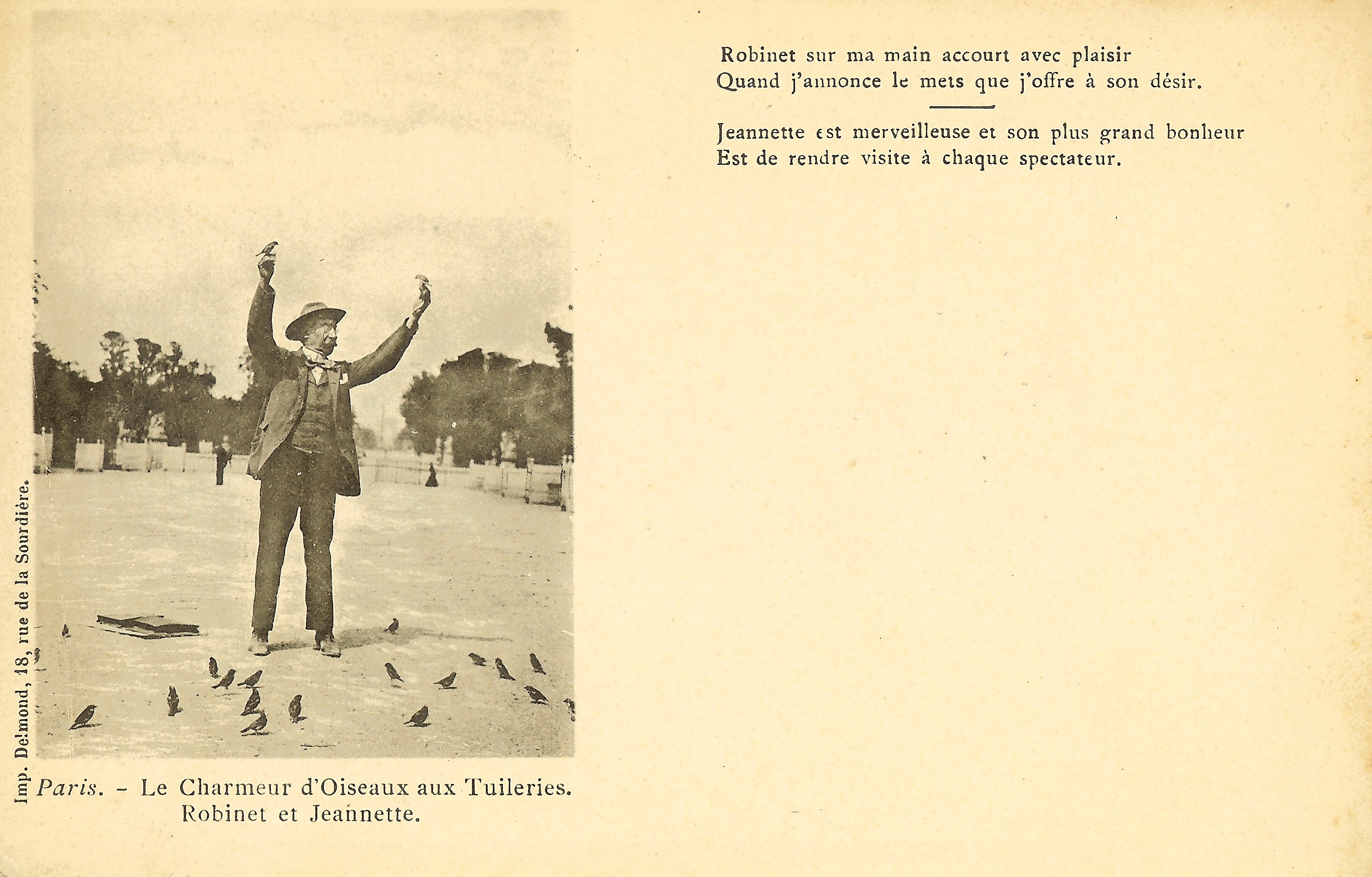 Years ago, some people made a precarious living luring little birds out of the air for the amusement of passersby, as shown in this postcard. The birds on his hands are called Robinet and Jeannette, according to the verse on the card.