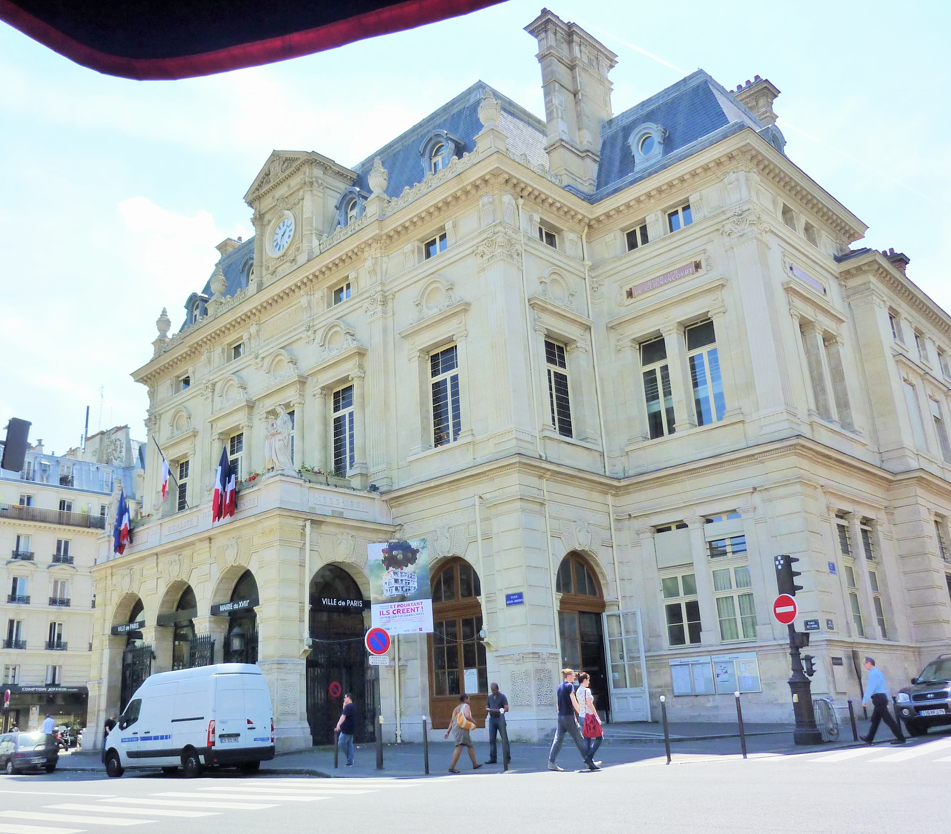 We got back on the tram. We limped onto the Metro. We broke our journey at the Place Jules Joffrin, where a pharmacist filled the prescription and gave us careful advice about side effects (also correct, we later found). Then we collapsed into café chairs and Norman took his first dose with a jolt of espresso. We had a grand view of the mairie opposite.