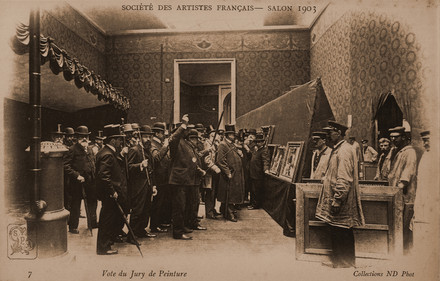 The first hurdle was getting accepted. The jury would look at hundreds of paintings a day, raising canes or umbrellas to indicate their acceptance of a particular artwork, as shown in the image below. An attendant wrote “A” on the back of paintings for “admis” and “R” for “refusé.” The accepted works were then ranked. A number one got you “on the line” – that is, roughly at eye-level. Number two meant just above and number three above that. If your painting was not numbered, it was “skyed” – hung high up where it would be hard to see and impossible to get close to.