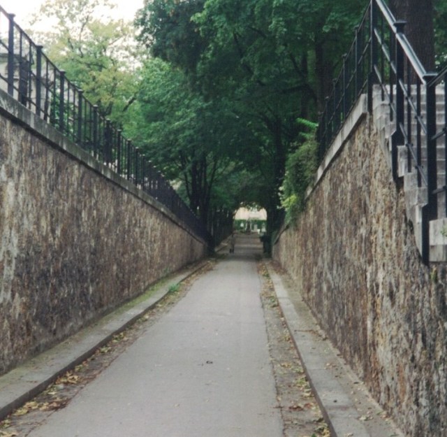 The following day, we wandered through the street market on the rue de Buci, buying a baguette, St-Nectaire cheese, and pears. Then we took the Metro to Montmartre and got out at Lamarck-Caulaincourt. Not far away we found a little square with a statue of a man and a woman leaning in towards each other, dedicated to the artist Steinlen.
