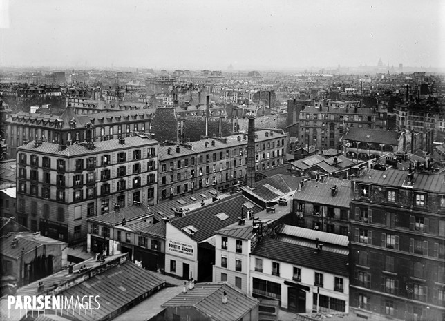 Immeubles parisiens. Quartier autour du canal Saint-Martin. Vue panoramique prise de la tour de l’usine 132-134 quai de Jemmapes. Paris (Xème arr.). Photographie de Charles Lansiaux (1855-1939). Plaque de verre, 07 septembre 1920. Département Histoire de l’Architecture et Archéologie de Paris.