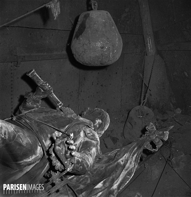 Guerre 1939-1945. Occupation. Destruction de statues pour récupérer les métaux. Le monument à Claude Chappe (1763-1805), ingénieur français, inventeur de la télégraphie aérienne, par Emile Louis Macé. Paris, 1941.