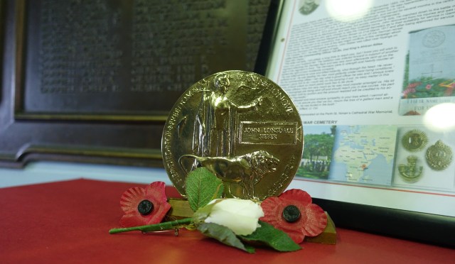 The students read out a short biography of Jack Sieber and the history teacher who oversees the Flowers of the Forest project, Laura Hobson, read the letter sent by Jack’s commanding officer to his wife. My cousin Jane had brought “the King’s Penny” – the inscribed copper disk sent to the relatives of the fallen – to be part of the small display set up on a table in front of the war memorial.
