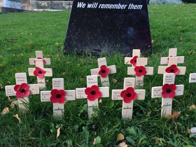 The band played, there was a piper, we all sang, the head girl and head boy read poems and letters, and there were presentations showing all the men and one woman from the school who gave their lives, as well as photographs from the students’ annual visits to the war cemeteries in France. I presented the library with copies of two Canadian books about the war (Vimy by Tim Cook and The Wars, a novel by Timothy Findley) as a thank-you for the welcome we had received.
