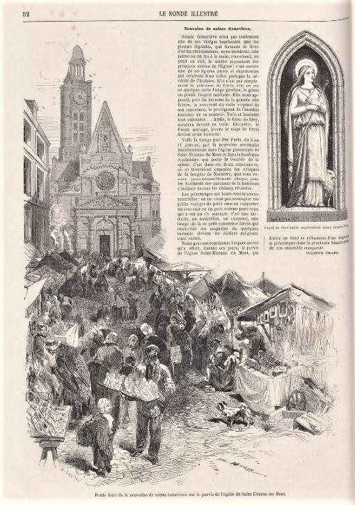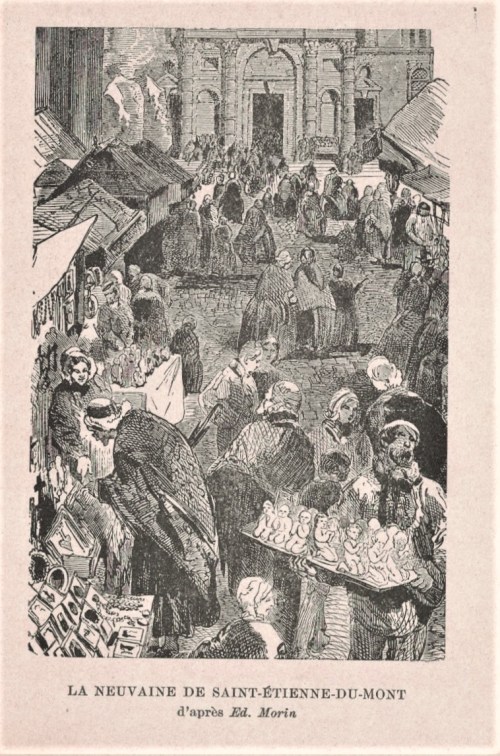 Other illustrations in the book depict quaint customs. We had never heard of the “La Neuvaine de Saint-Etienne-du-Mont” (the Novena of St-Etienne-du-Mont), which takes place in the first half of January at the church near the Pantheon. Boutet calls it “bien peu parisien” and likens it to a church festival in Brittany. Little booths selling religious trinkets would be set up near St-Etienne and the street in front would be thronged with nuns. Novenas consist of a set of special prayers or services on nine consecutive days.* This one is directed to Paris’s patroness, Sainte Geneviève, and according to St-Etienne’s website, these services still take place every January, from the 3rd to the 11th, although there was no mention of booths selling religious paraphernalia.