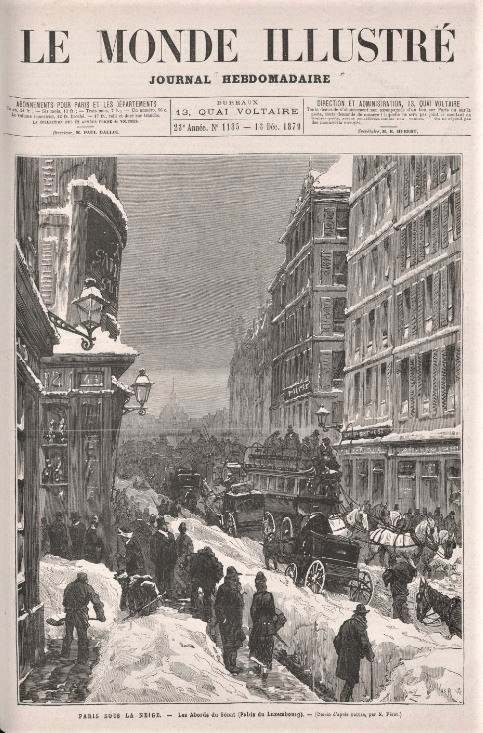 The newspaper explains that Férat made the sketch from life the day after a heavy snowfall in 1879, as residents tried to get on with a normal day under abnormal circumstances. It also identifies the location: near the Senate (the Palais du Luxembourg), likely the rue de Tournon.