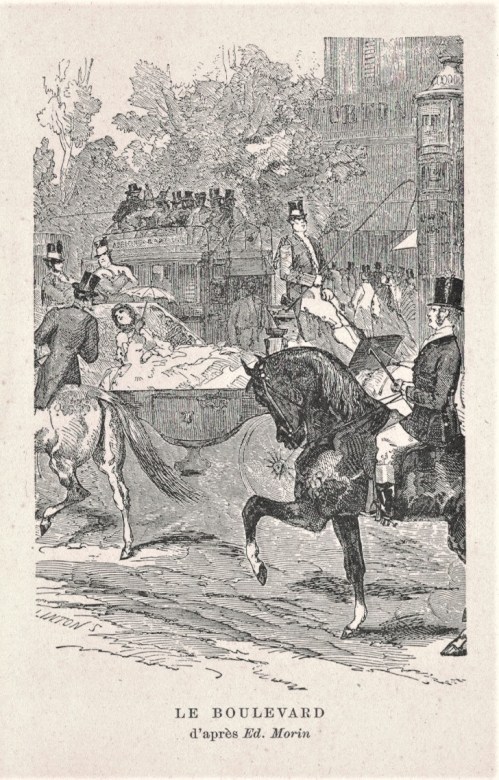 « Le Boulevard, d’après Ed. [Edmond] Morin » shows an omnibus on a brighter day. A glimpse of the Café Tortoni in the background places the scene in the Boulevard des Italiens. The original was also from Le Monde illustré.