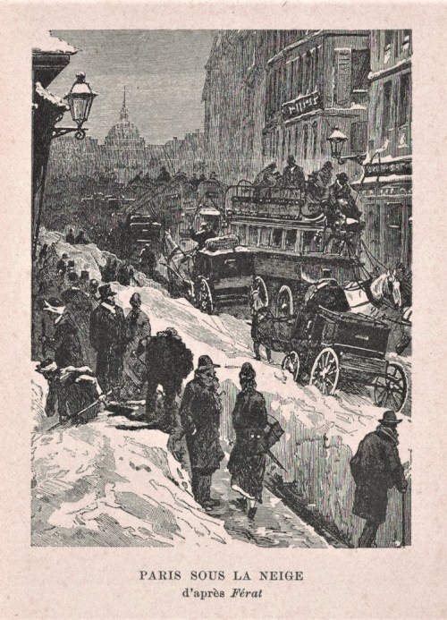 That year, the snow was at most half an inch deep. But in an odd little book, we found an image of a Paris omnibus attempting to make its way through much higher drifts. Now that’s what we call snow.