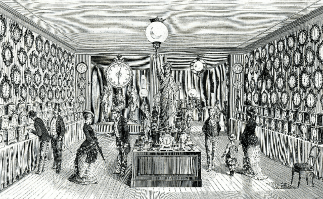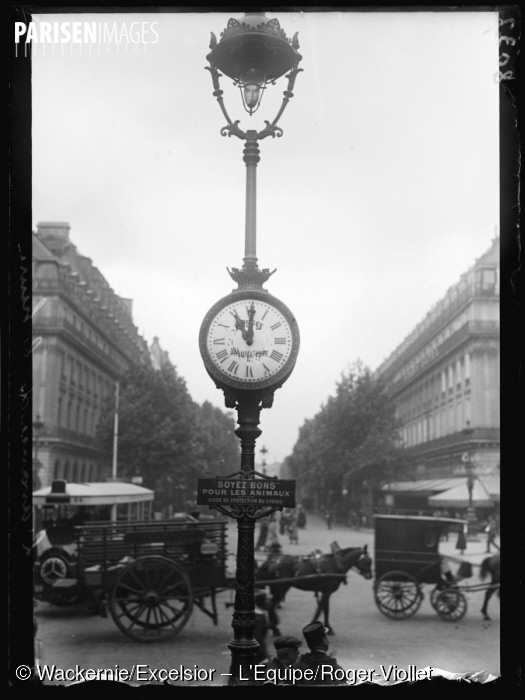 For a visitor in 1881, it was the clocks. He marvelled “that the clocks throughout their hotels were, what is unusual with hotel clocks, keeping accurate time.” He was also astounded to find “numerous clocks standing on graceful light iron pillars in the squares, at the corners of streets, and in other conspicuous positions about the city.” Parisians lingered by these public clocks to set their watches. The one shown below stood in front of the Church of la Madeleine.