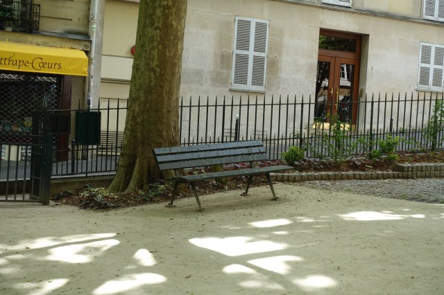 Norman and I have a bench that is part of our history together – the one where we had our first picnic in Paris, the day after our arrival, on our first trip to the city together. Some years later, we went back to the Place Constantin Pecqueur in Montmartre. It is a tiny park with a few trees, a statue, and a great many benches. The benches have been moved away from the centre of the park where we sat, so we do not know exactly which one is “ours.” But it would have been one like this.