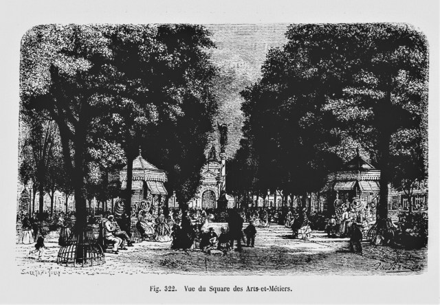 The first picture in Alphand’s book to show anybody sitting down is on page 213, in a view of the Square des Arts et Métiers.