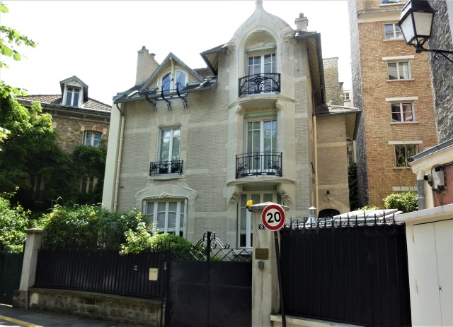 Next door, near the entrance to one of those private streets known as “villas,” is a calmer 1907 Guimard construction, the Hotel Deron-Levent, built for a textile merchant. Alas, poor Charles Deron-dit-Levent didn’t have long to enjoy his mansion. He died there in 1911. However, in 1912, Guimard was called upon to design his tombstone for the Auteuil Cemetery, so Mr. Deron got to live in a Guimard structure for eternity.