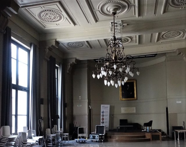 He even turned on the lights in the ballroom, which began to look a bit grander and less abandoned, despite the ugly modern chairs and plastic tables.