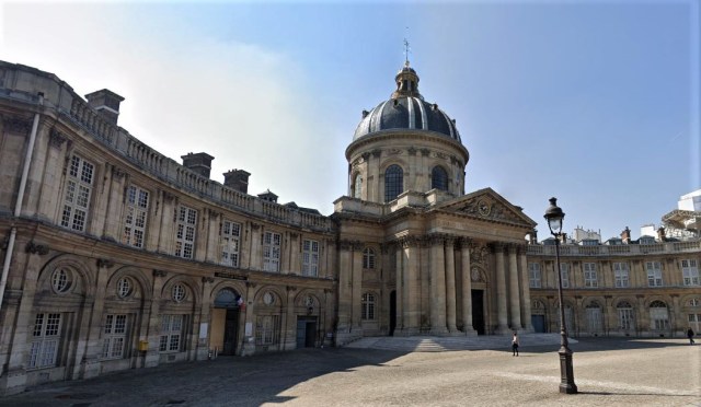 The Institut de France on the Left Bank of the Seine, near the Pont des Arts, is a familiar sight. We’ve walked past many times, and never thought we’d have occasion to enter it ourselves. But one never knows where research will take one. Just follow the rules. Or not, as the case may be.