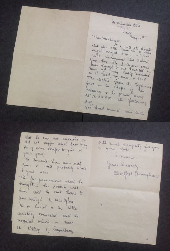 In May 1918, when James Amess was in her care, she was at the No.2 Canadian Casualty Clearing Station, Remy Siding, on the Belgian border.
