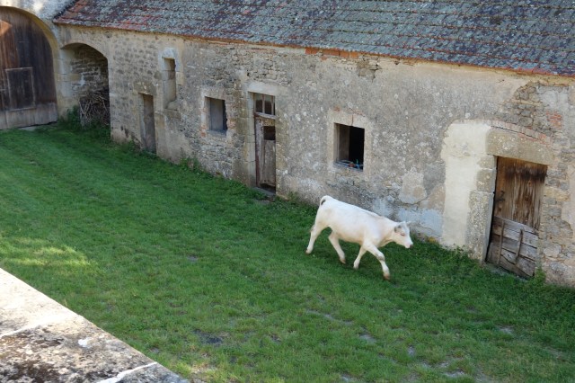 The house remains cool in hot weather (thick stone walls will do that), but it is also cold in winter. It is quiet – if you don’t count the birds, the insects, and the heifers in the adjoining field (who sometimes stray, as shown here), as well as all kinds of small creatures going about their own business in the hedges and long grass.