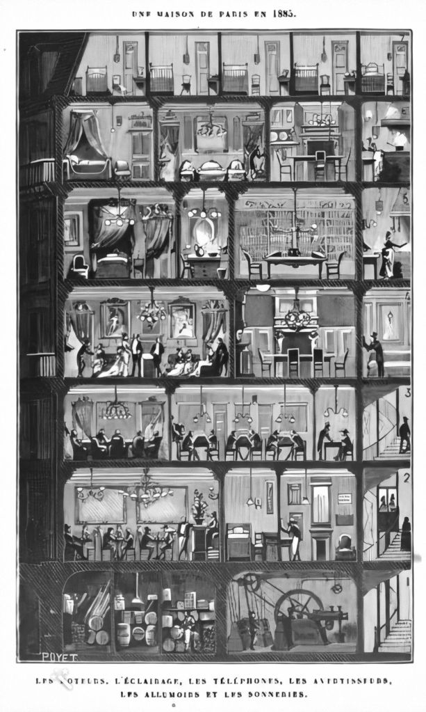The second is an illustration by Louis Poyet from a book called L’Electricité dans la maison, published 30 years later, in 1885. It shows seven floors (although here the bottom one is a cellar) and the top floor is a neat row of identical chambres de bonne. They are empty, because the maids are at work. Given the subject of the book, the important feature here is the electric bell in each room, so that the family can summon a maid when needed – presumably in the middle of the night, because that would be the only time the rooms were occupied.